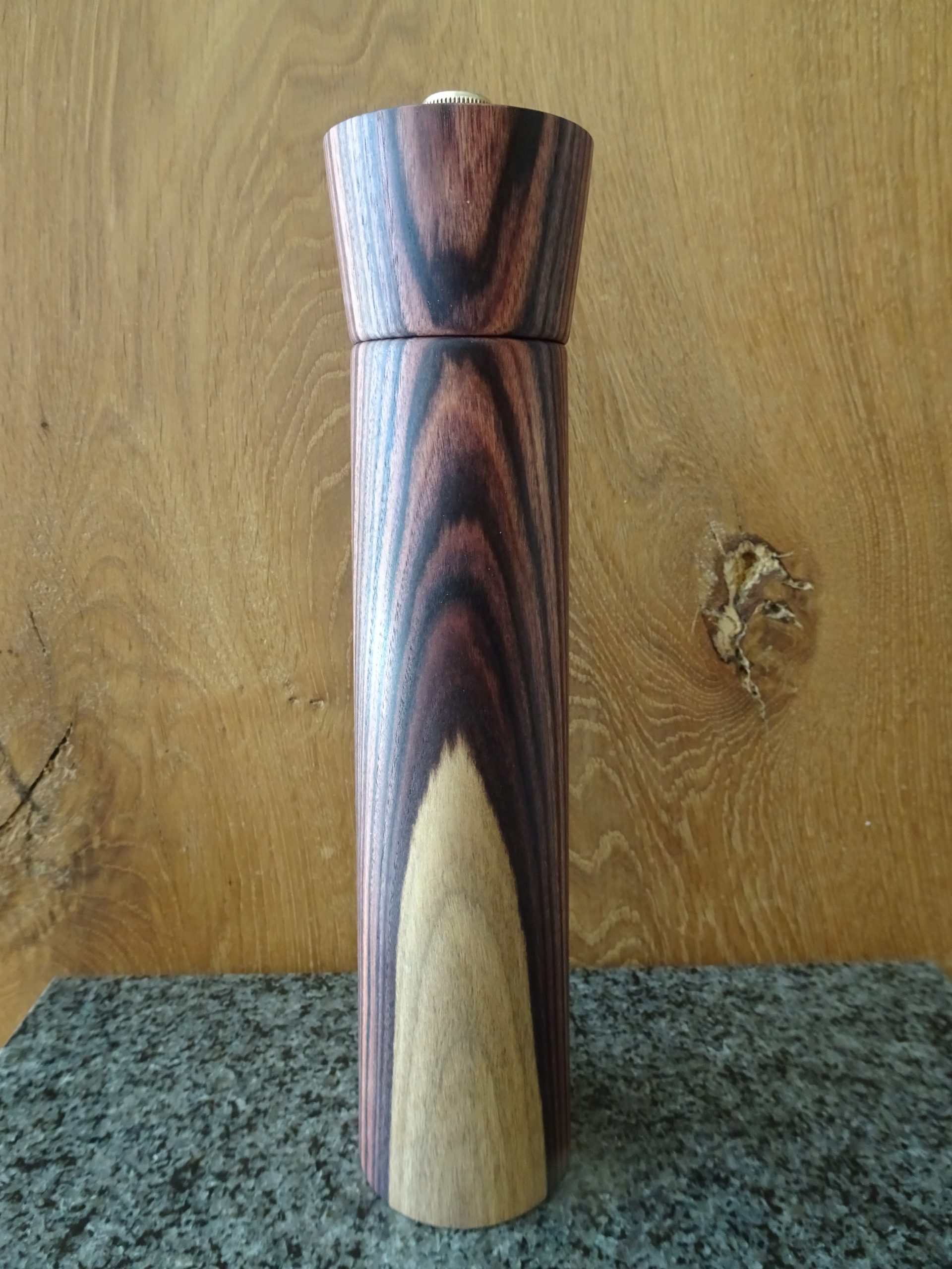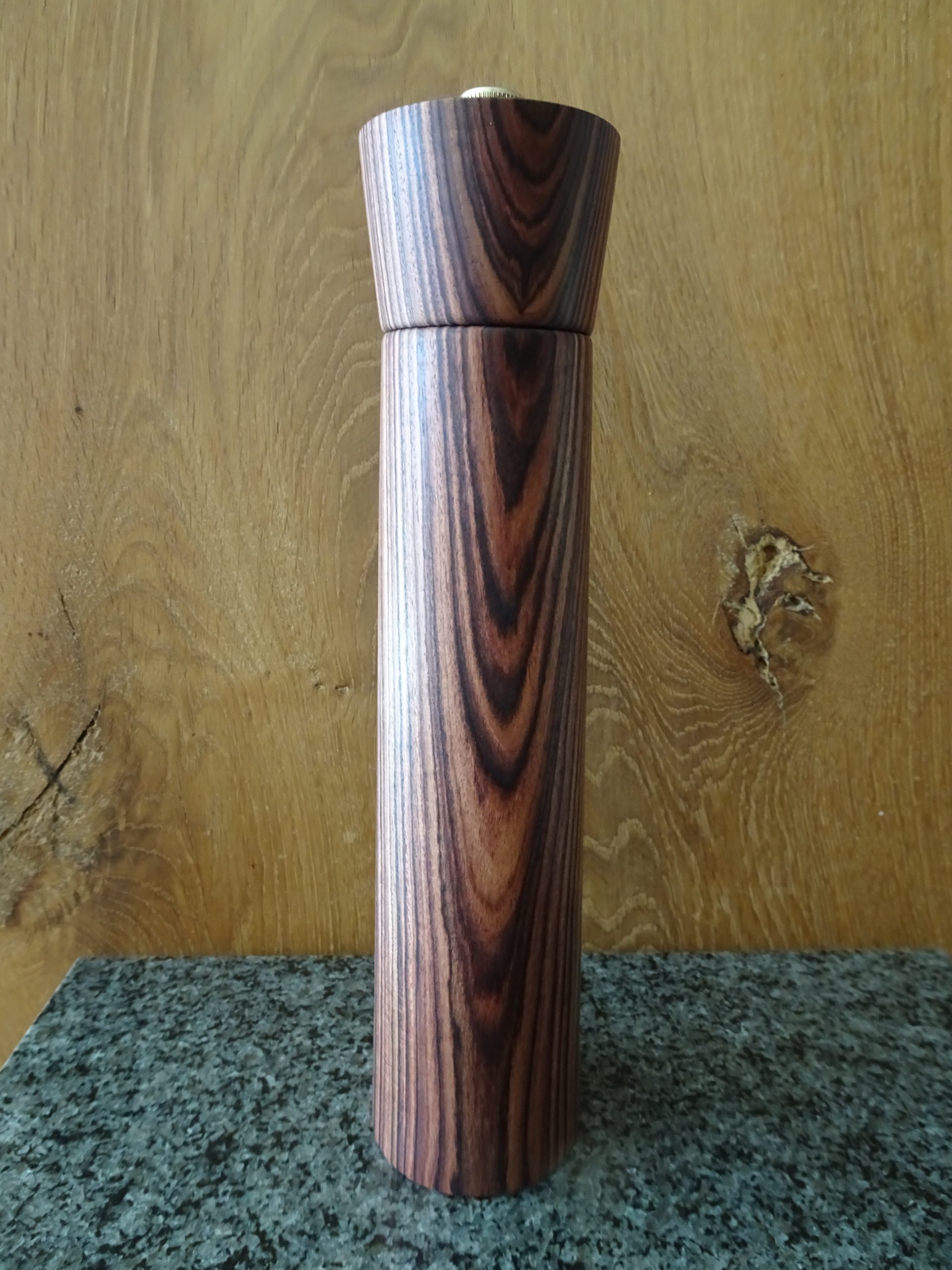 Ich hatte schon längere Zeit ein ganz besonders Stück Holz zu Hause. Jetzt ist daraus eine Pfeffermühle entstanden. Die Mühle ist aus Kingwood. Ein sehr schönes Holz mit fantastischer Maserung. Auch hier habe ich das Keramikmahlwerk von Lidrewa aus dem Dictum-Sortiment verwendet. Die Bohrungen entstanden mit den Multi-Spur-Bohrern von Fisch. Die Passungen habe ich mit dem Dosenschaber von Jimmy Clewes hergestellt. Die Mühle wurde bis Körnung 400 geschliffen und dann geölt.