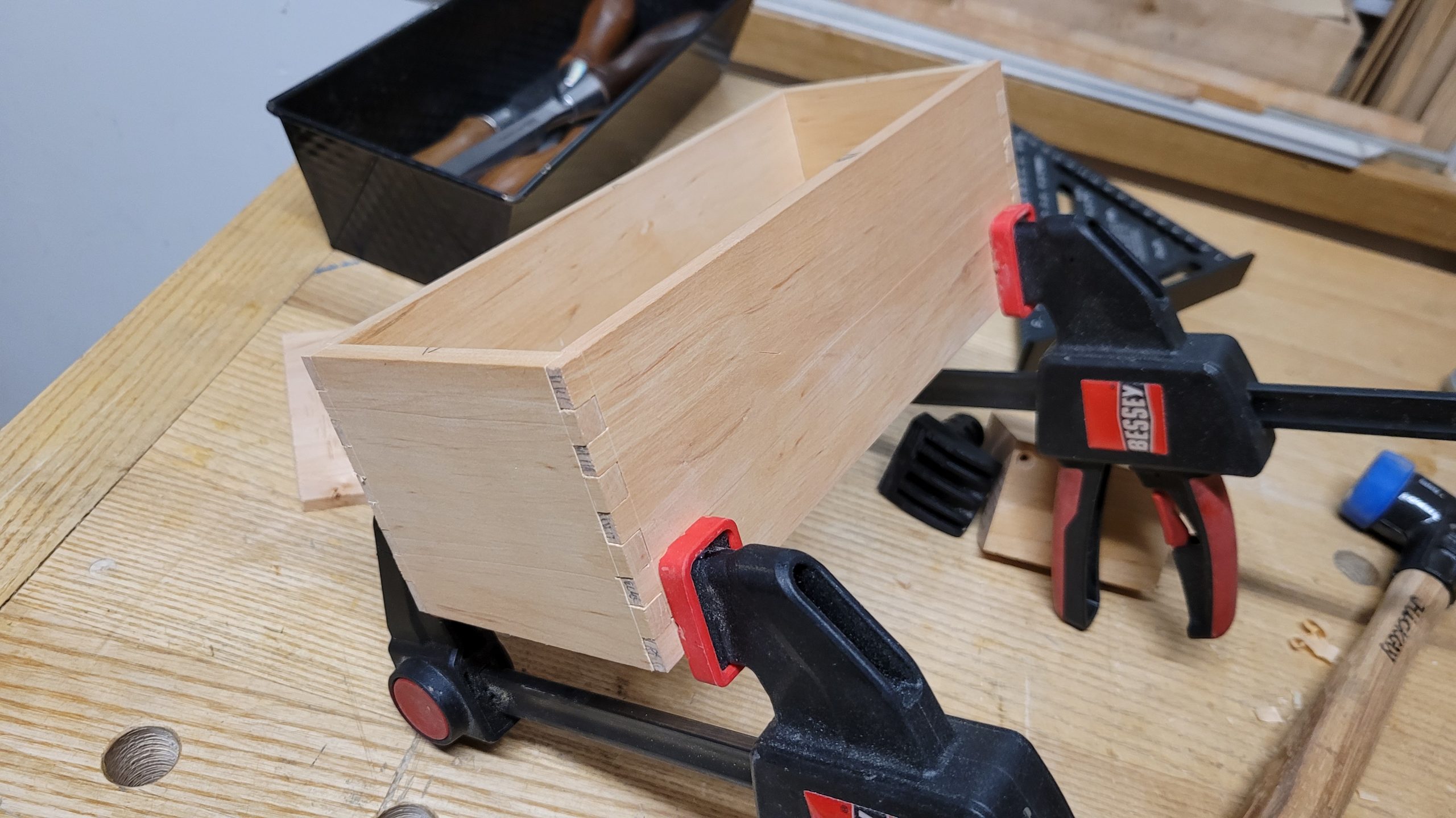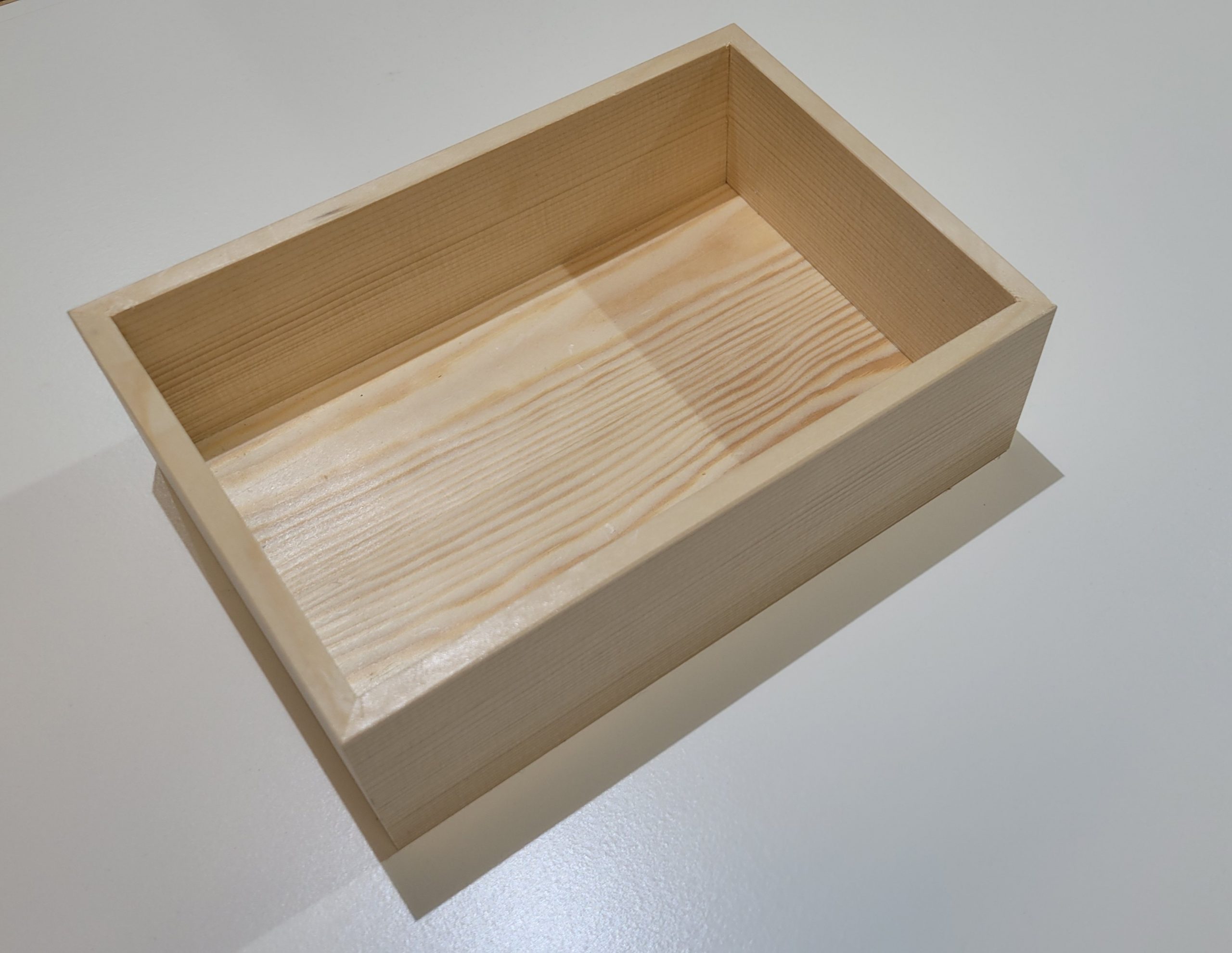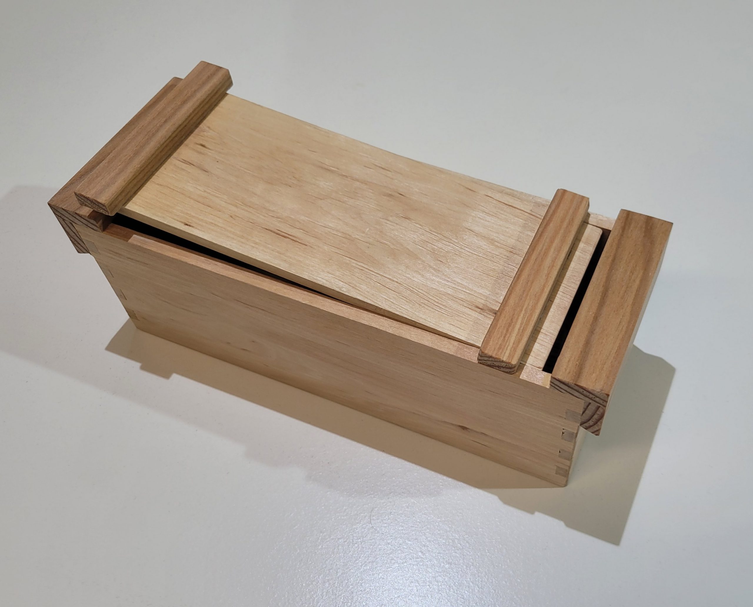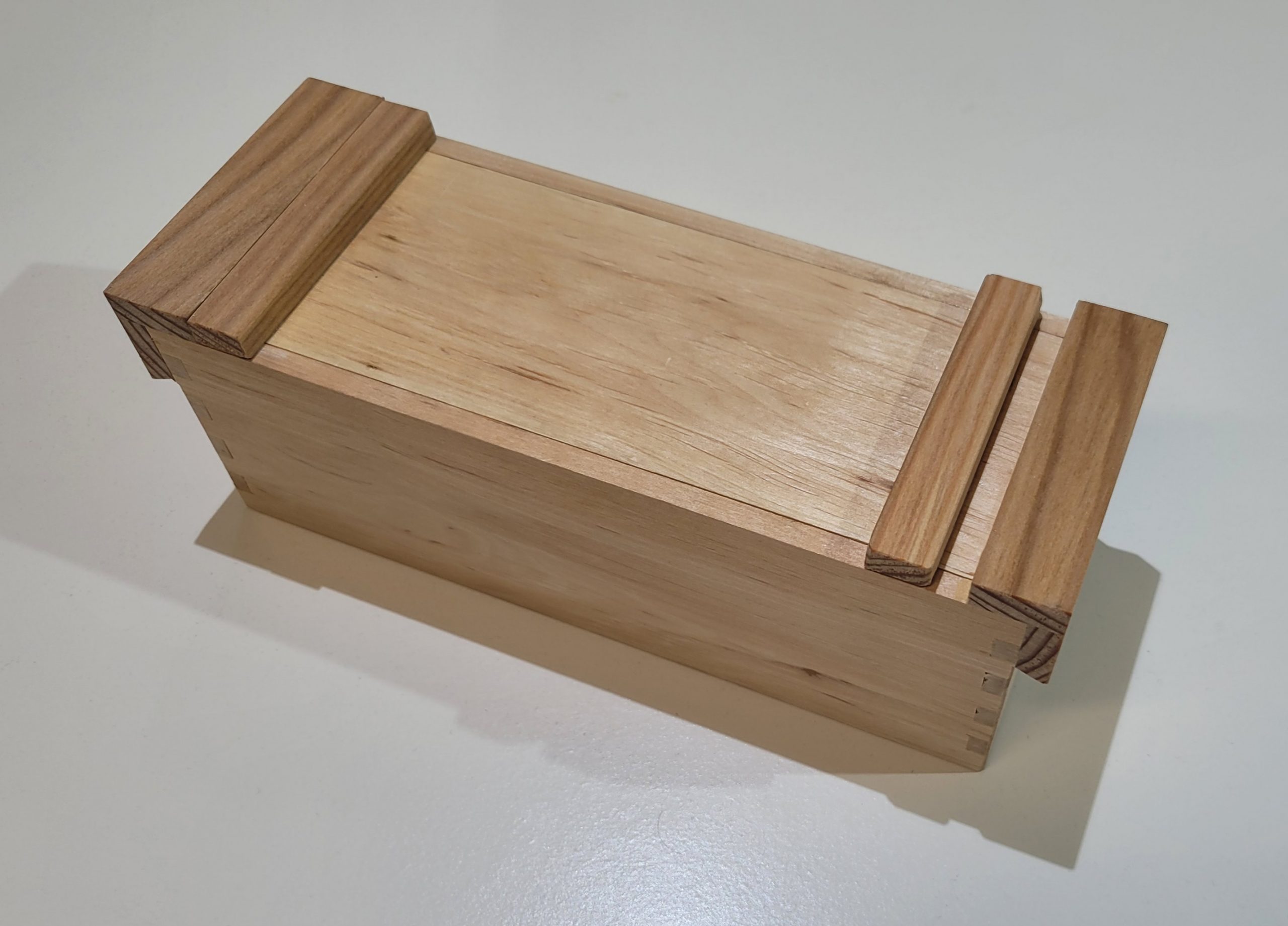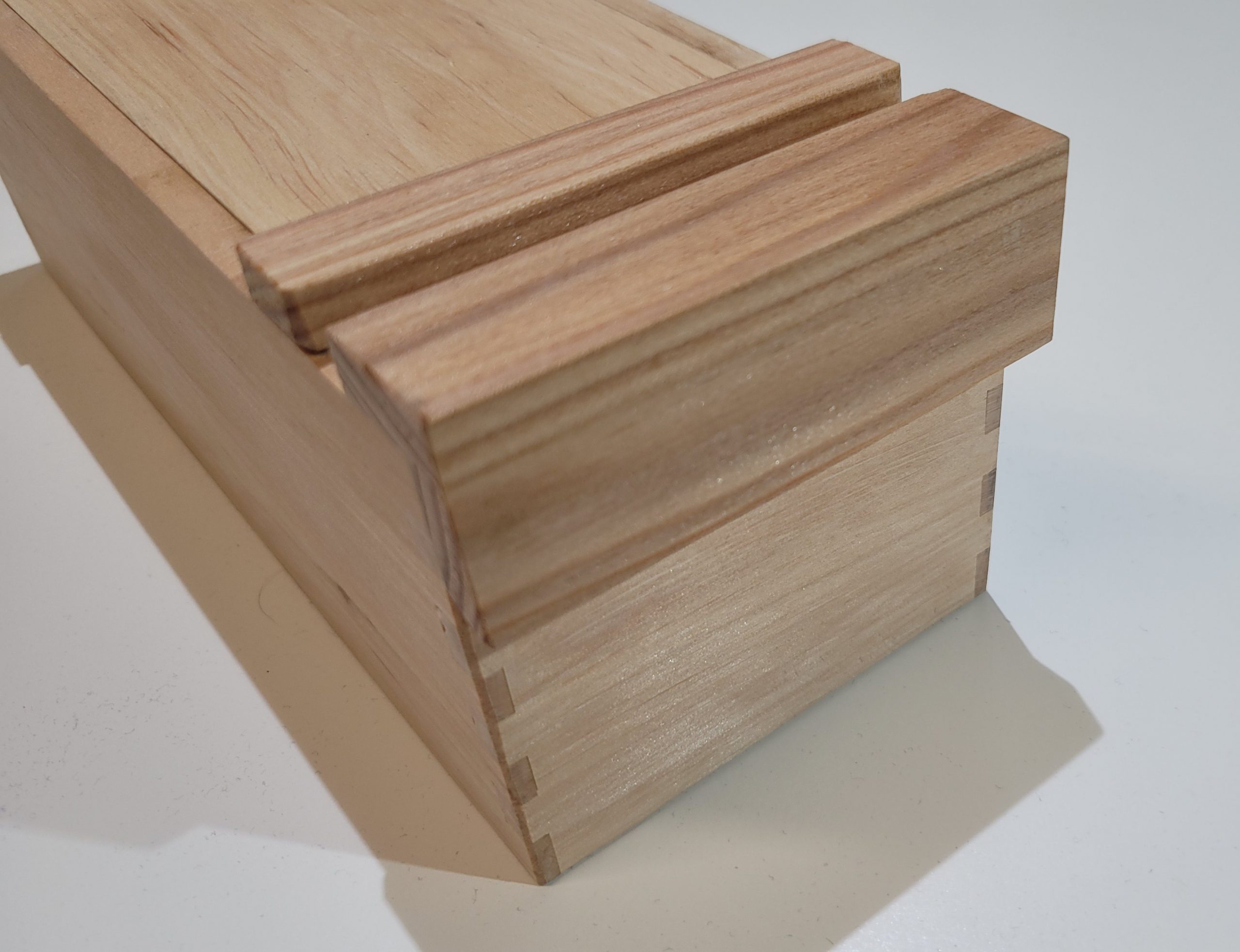 Griffelschachtel in der Bauart einer japanischen Werkzeugkiste, hergestellt aus Holzresten einer alten Palette. Verwendetes Werkzeug Handhobel, Nut- und Grundhobel, Streichmaß, Stemmeisten, Laubsäge uvm.