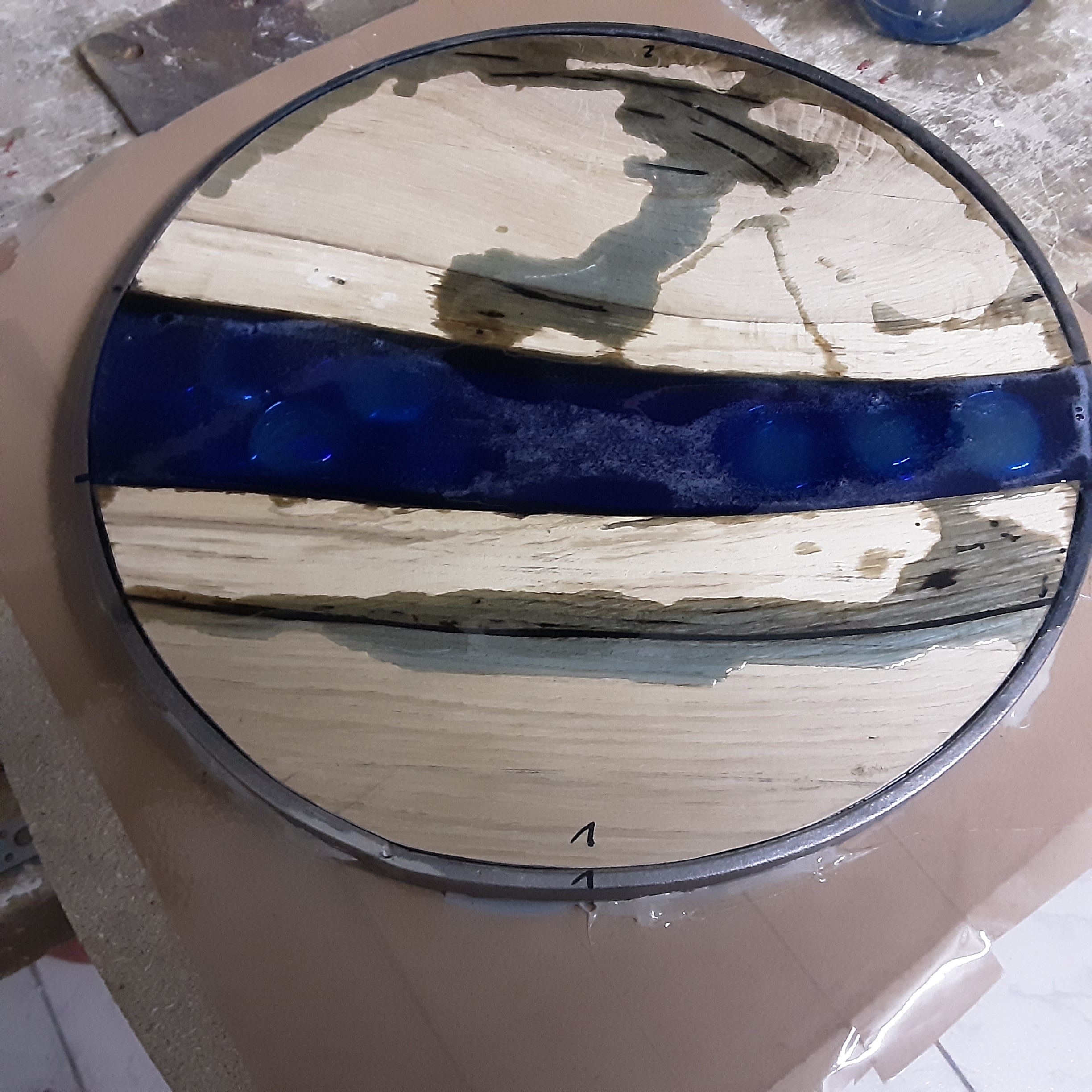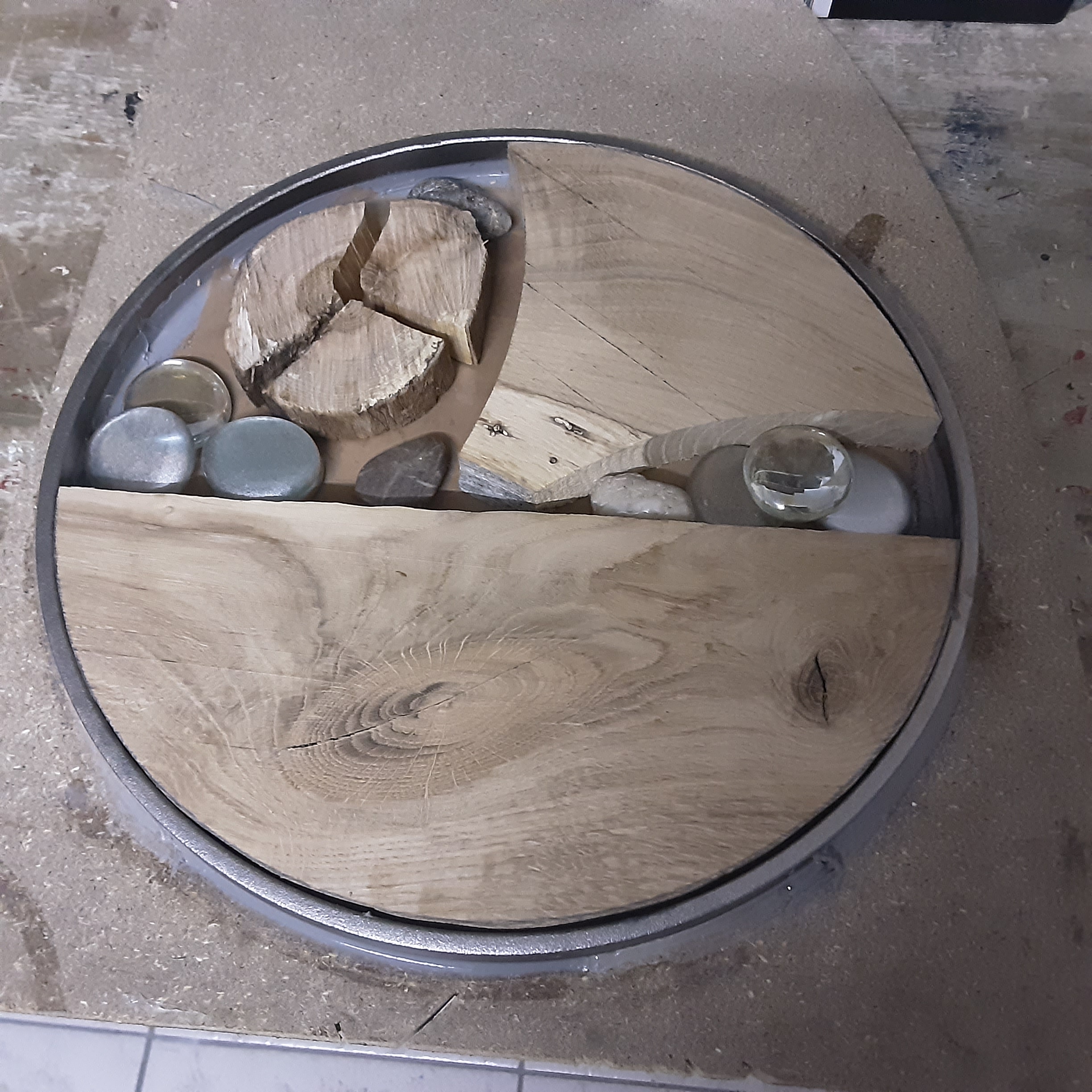 Der „Lampenschirm“ dieser Lampe ist der Ast einer Korkeiche, bei dem das Holz bereits verrottet war und nur noch das Kork übrig geblieben ist. Als Sockelmaterial wurde stilecht Eichenholz verwendet, aus welchem mittels Fräszirkel und Oberfräse ein Kreis ausgefräst wurde. Als Leuchtmittel wurde eine LED-Filamentlampe verwendet. Die Oberflächenbehandlung des Sockels erfolgte mit Hartwachsöl.