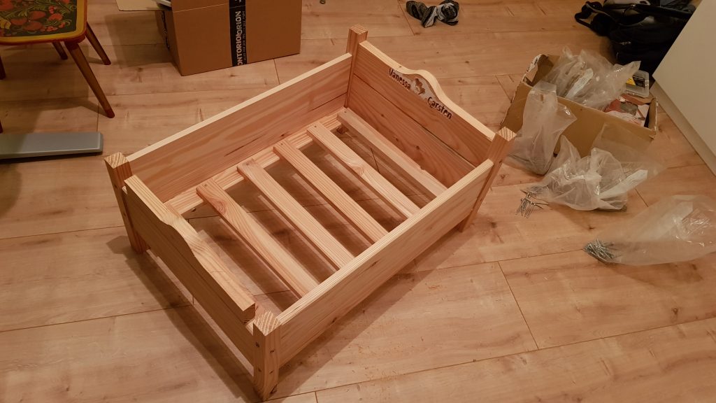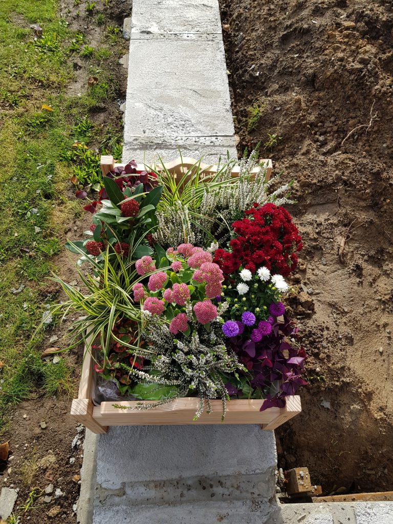 Beschaffung von Holzresten aus einem lokalen Sägewerk. Alle Holzlatten mit der Kappsäge gekürzt. Die Bandsäge wurde für die oberen Rundungen genutzt. Zum Schluss der Holzarbeiten noch mit der Dekupiersäge die Namen des Brautpaares ausgesägt. Danach ab in die Gärtnerei zum Beflanzen.