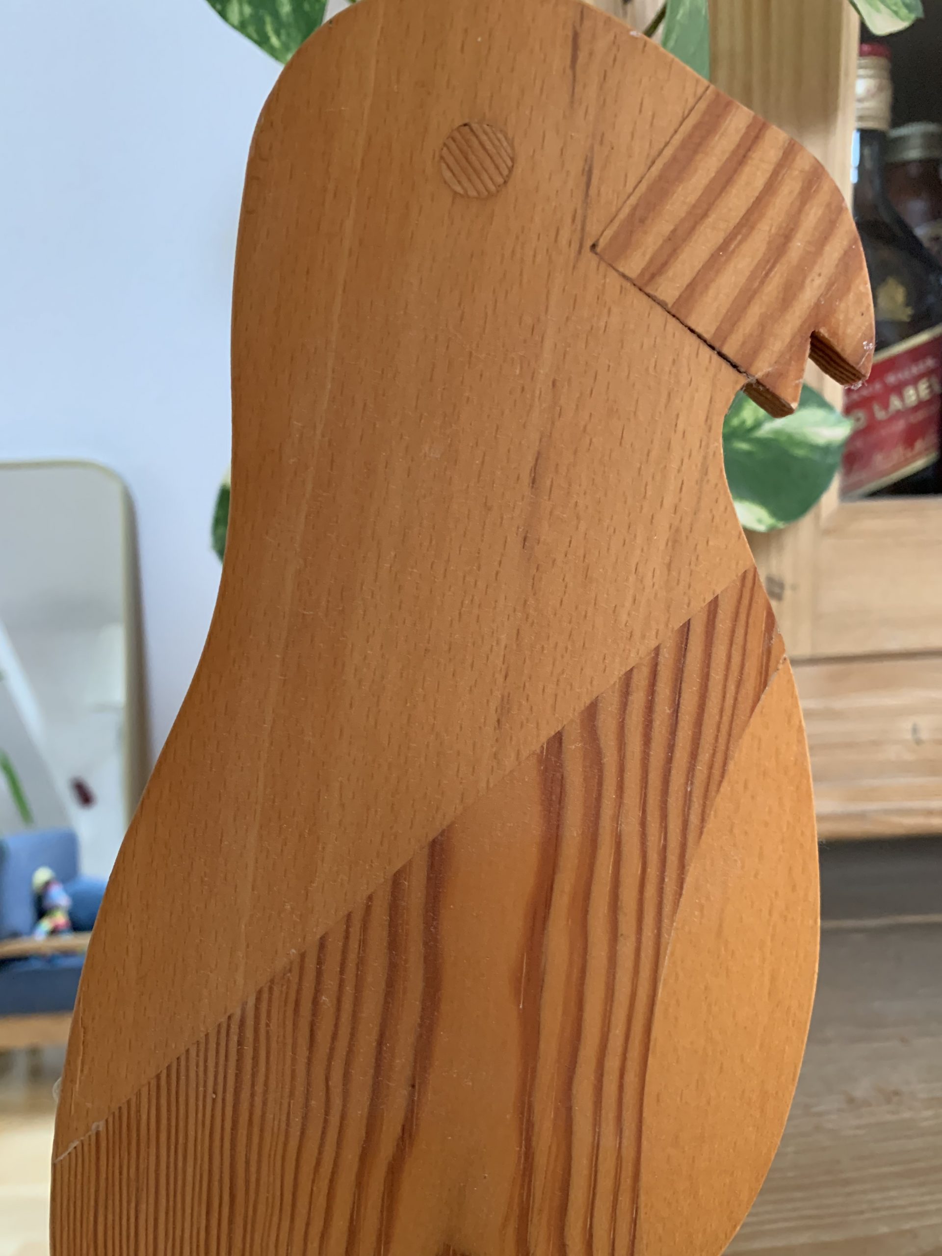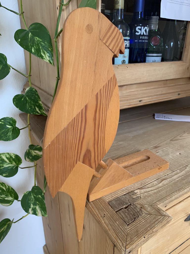 Für den Papagei wurden verschiedene Holzarten verleimt und anschließend mittels Schweifsäge in Form gesägt. Zum Abschluss wurde der Vogel geölt.
