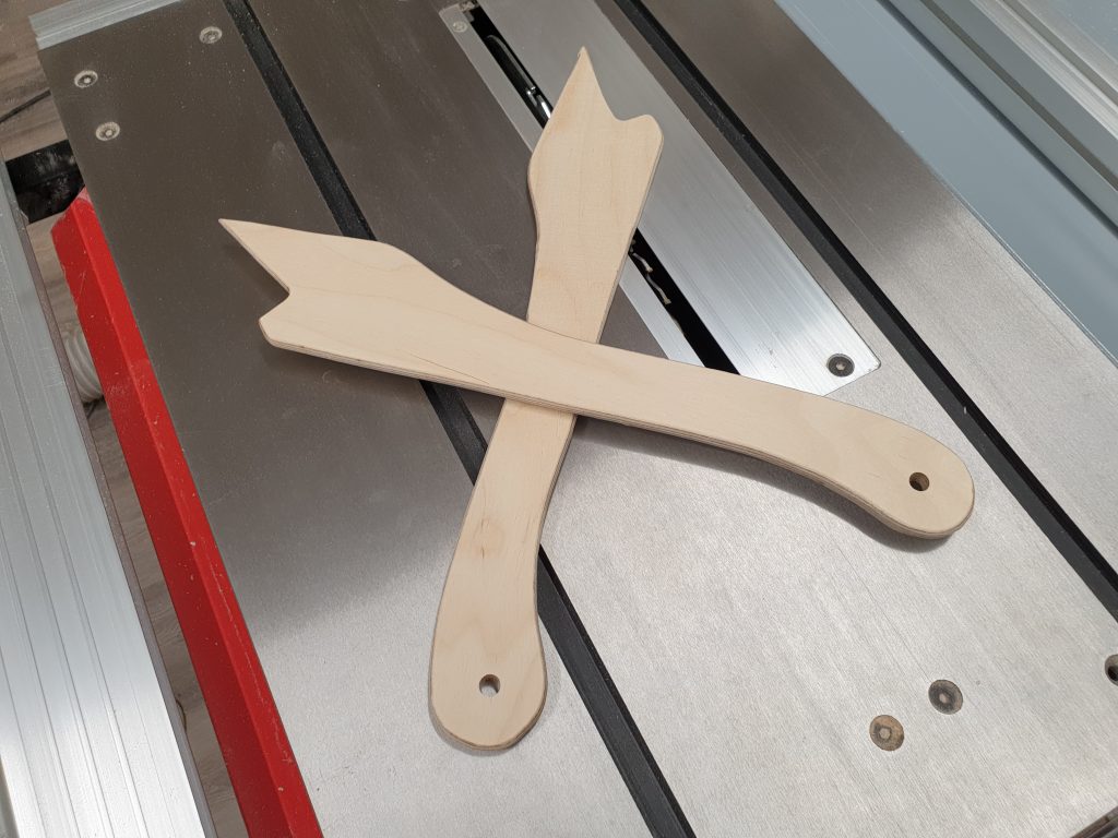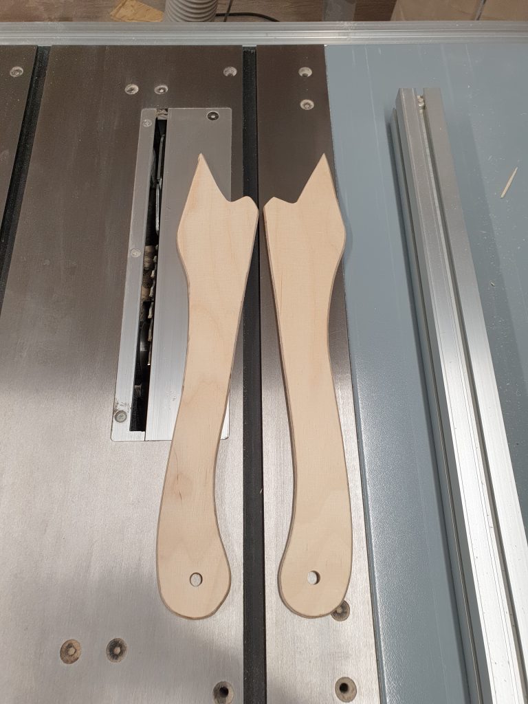 Die Push Sticks aus 9mm Multiplex (Birke) wurden recht schlicht gehalten, da diese leicht in Kontakt mit dem Sägeblatt kommen. Nach dem Aussägen mit der Stichsäge wurden lediglich die Kanten noch mit einem Fräser und Schleifpapier abgerundet.