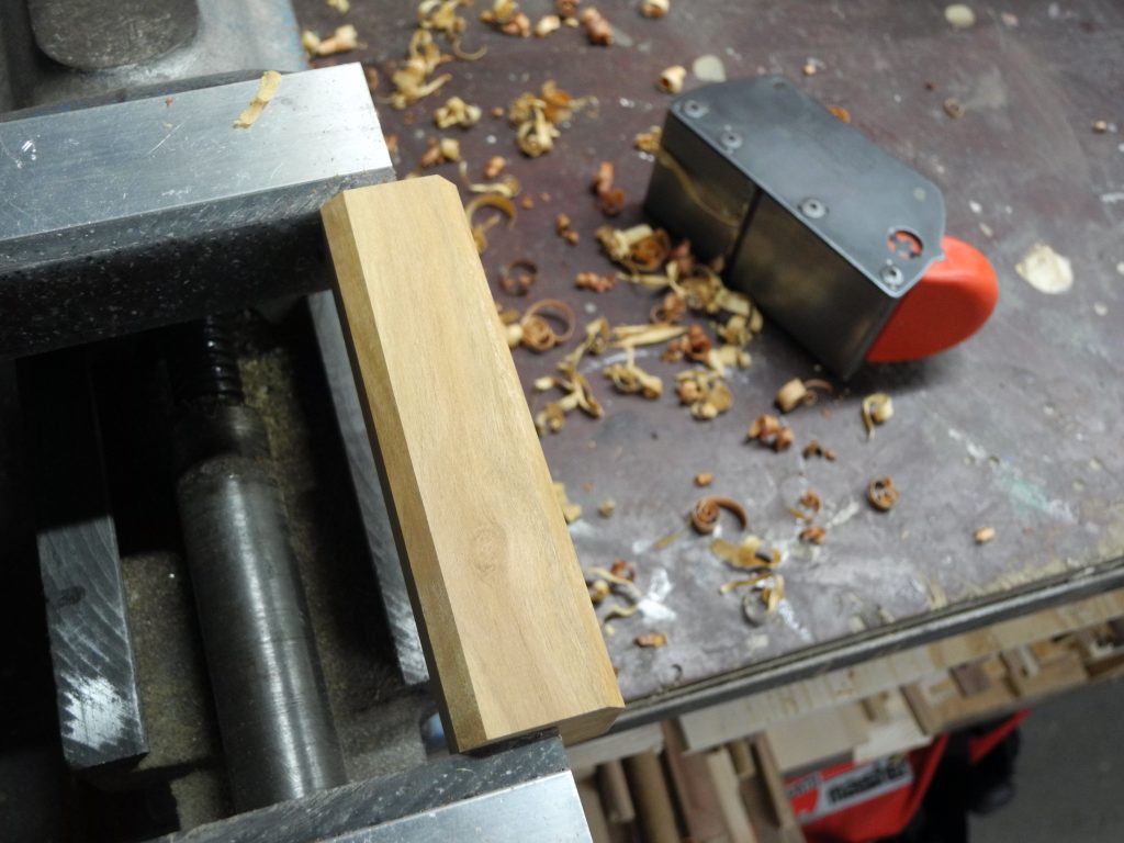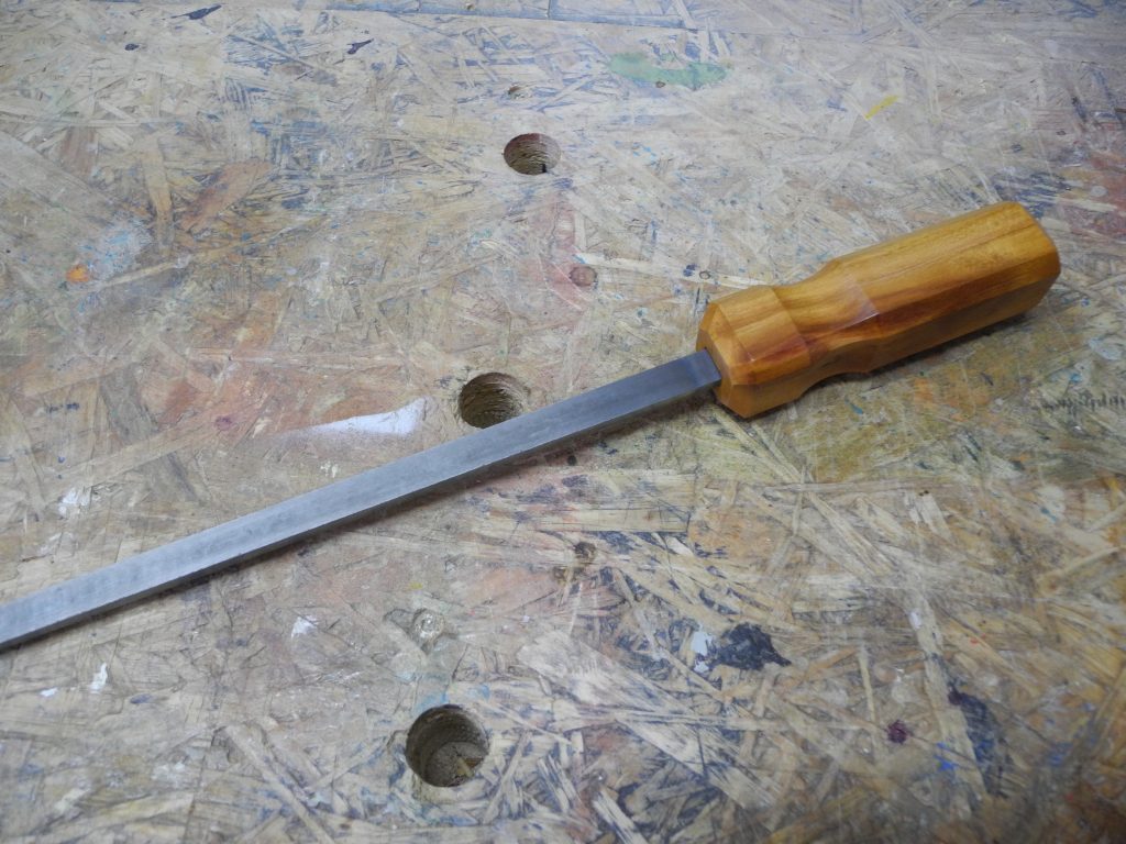 Für das Heft wurde ein sehr „farbenfrohes“ Reststück einer Zwetschge verwendet. Zunächst wurde mit dem Streichmaß das grobe Maß angerissen und mit der Zugsäge abgelängt. Anschließend habe ich mit dem Rali-Kantenhobel die Fasen und Flächen gehobelt, dieser eignet sich hierfür mit seiner sehr fein einzustellenden Hobeltiefe hervorragend. Anschließen sollte eine Griffmulde eingearbeitet werden, was mit dem Spindelschleifer deutlich bequemer durchzuführen war, als mit der Raspel. Nachdem die Vierkantbohrung für den Stahl eingearbeitet war, habe ich das Heft mit einer Ziehklinge geglättet und anschließend zum Schutz vor Wasser- und Ölflecken mit einer dicken Schicht Schellack aus selbst angesetzter Stammlösung poliert. Der Wetzstahl wurde dann mit einem PU-Konstruktionskleber permanent ins Heft gelebt, hiermit habe ich auch bei starker Beanspruchung die besten Erfahrungen hinsichtlich Langzeitfestigkeit gemacht.