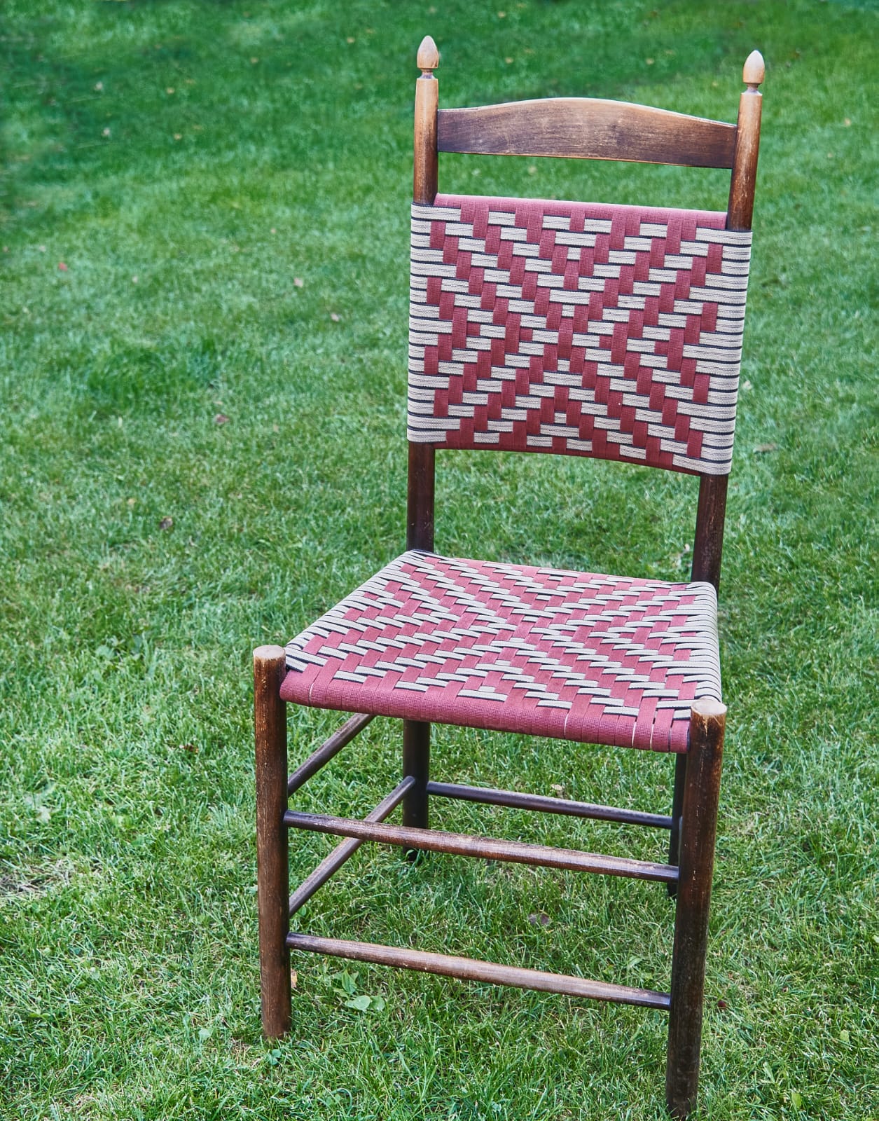 Hier handelt es sich um einen Shaker Stuhl. Shaker Stühle zeichnen sich unter anderem durch ihre Leichtigkeit aus. Das für diese Stühle typische Geflecht musste erneuert werden. Es besteht aus stabilen Baumwollbändern, die ineinander verflochten werden. So ergibt sich dieses Muster und zugleich eine hohe Stabilität.