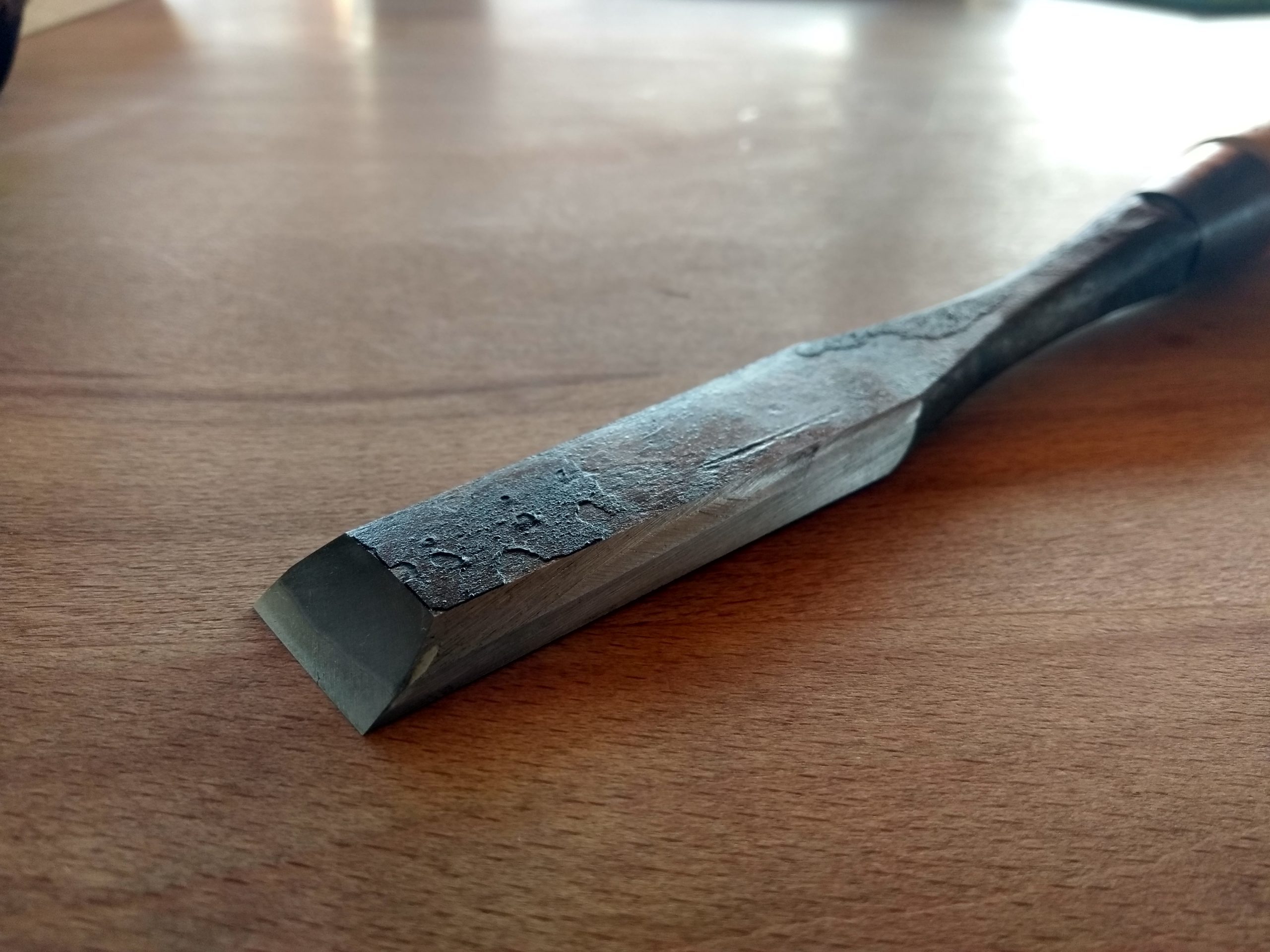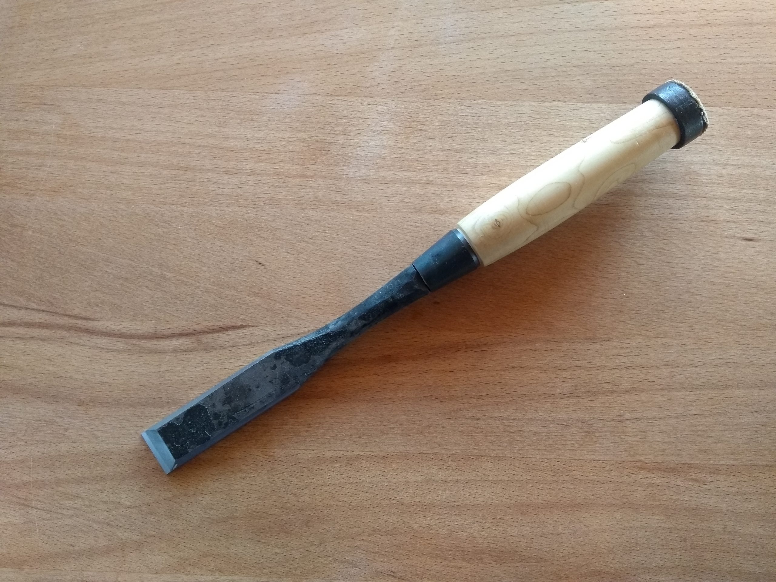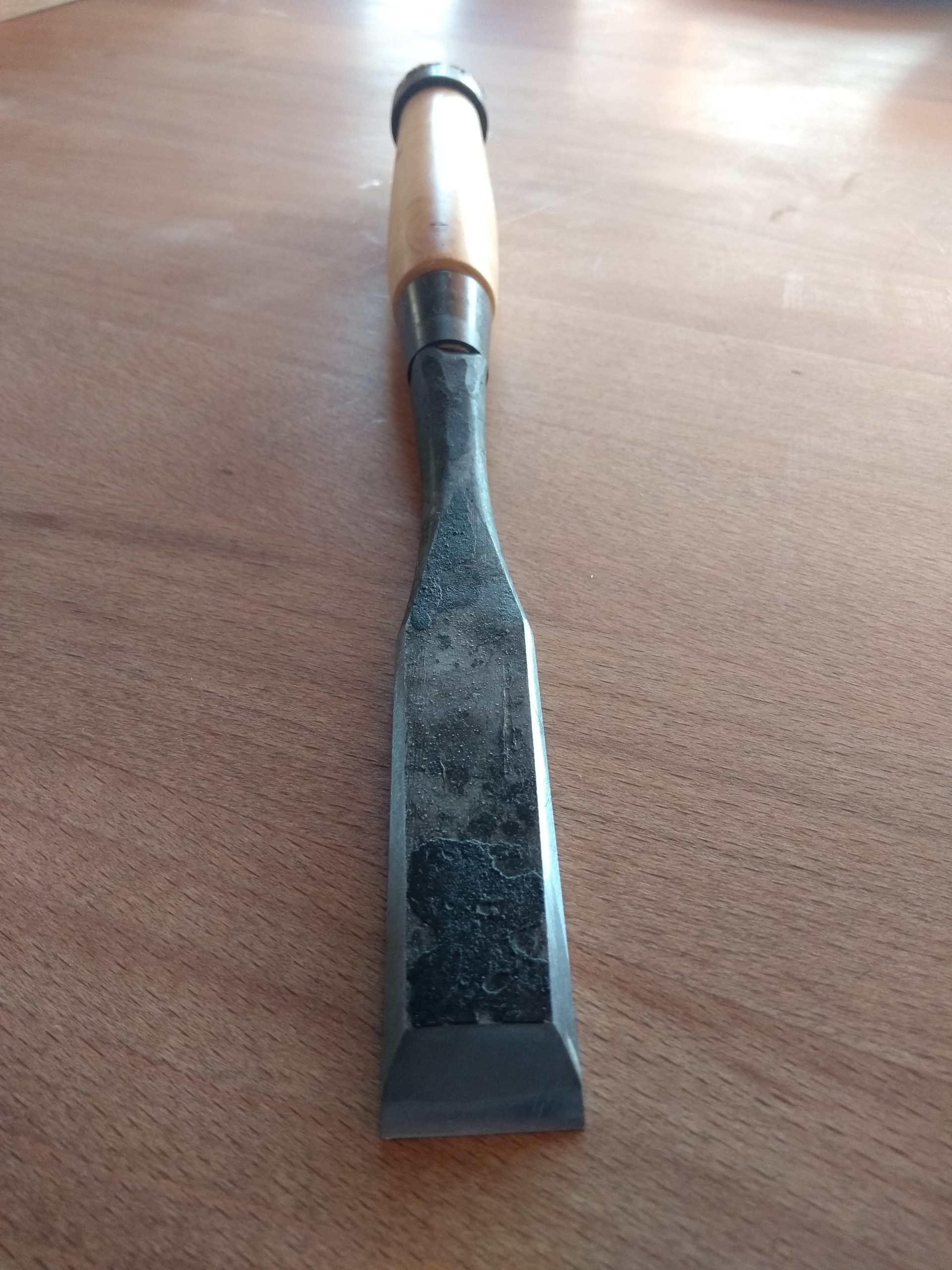 Seit langem bin ich von japanischen Stemmeisen begeistert, nun habe ich mich selbst am Schmieden versucht. Entstanden ist eine Mischung aus japanischem und europäischem Stil. Die Schneidlage besteht C100 Stahl, feuerverschweißt auf Baustahl. Die Spiegelseite ist flach, ohne Ura. Anschließend in Öl gehärtet und im Backofen wärmebehandelt. Das Heft habe ich aus Flieder gedrechselt, anschließend geölt und gewachst. Zwinge und Schlagring entsprechen dem japanischen Vorbild.