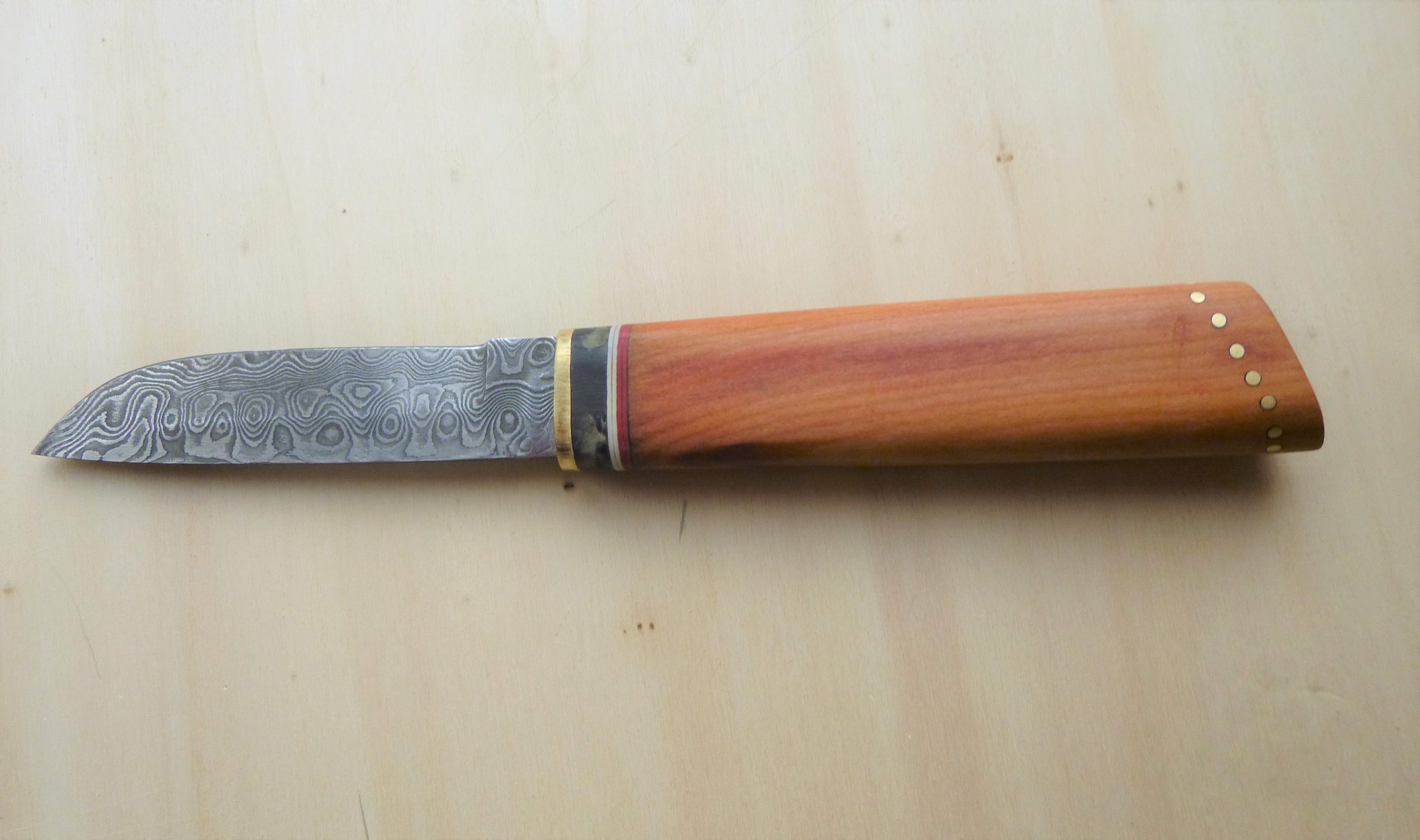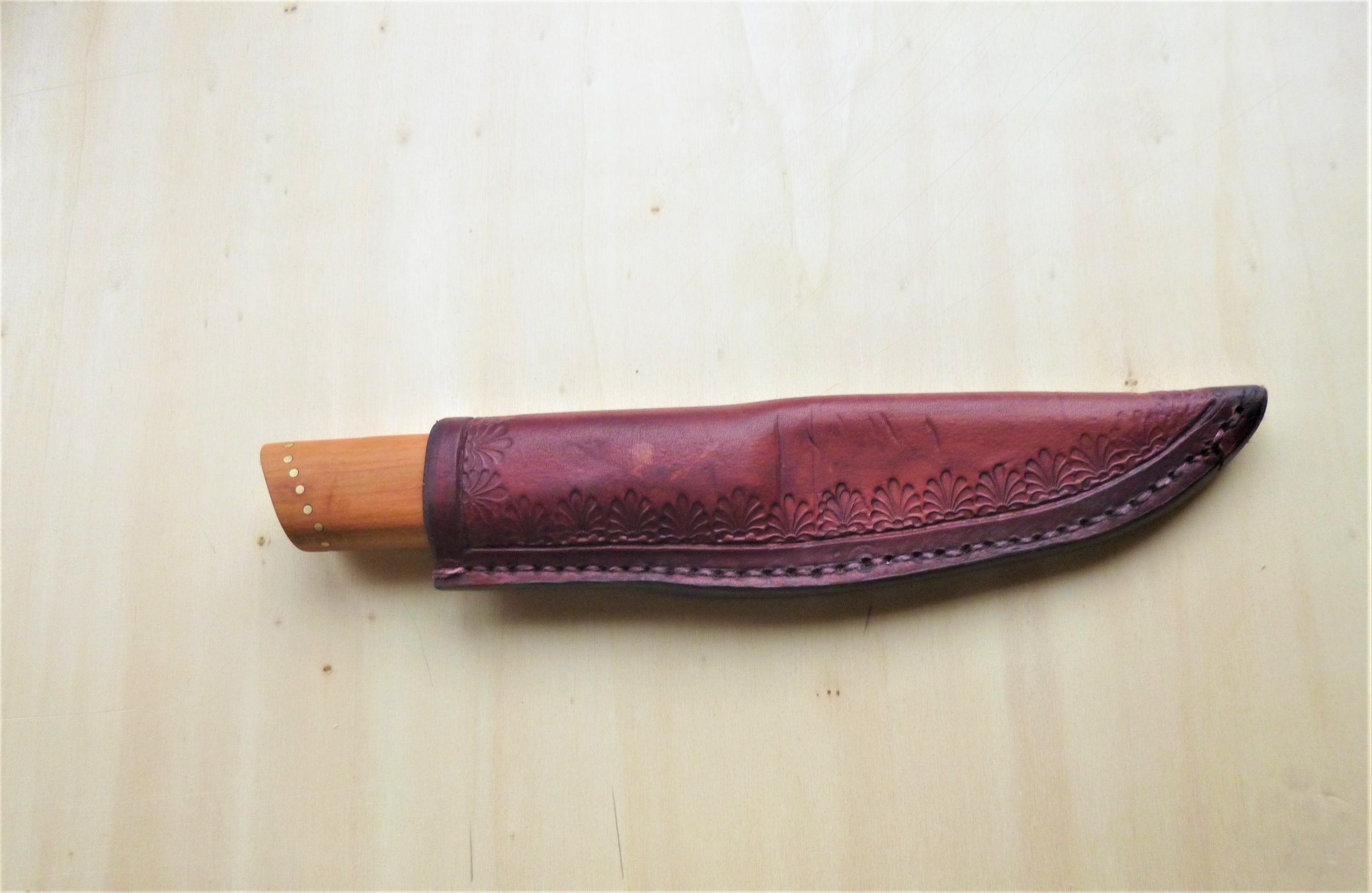 Ich habe einer Damastklinge von DICTUM einen Griff verpasst. Als Griffmaterial habe ich ein 30 Jahre altes Stück Kirschbaumholz verwendet. Dieses Stück ist unglaublich hart geworden und hat einiges an Schleifarbeit erfordert. Zwinge – Messing – Büffelhorn – Vulkanfiber. Die Messerscheide wurde aus 3 mm Rindsleder gefertigt – punziert und mit Sattlernaht handvernäht, rot eingefärbt.