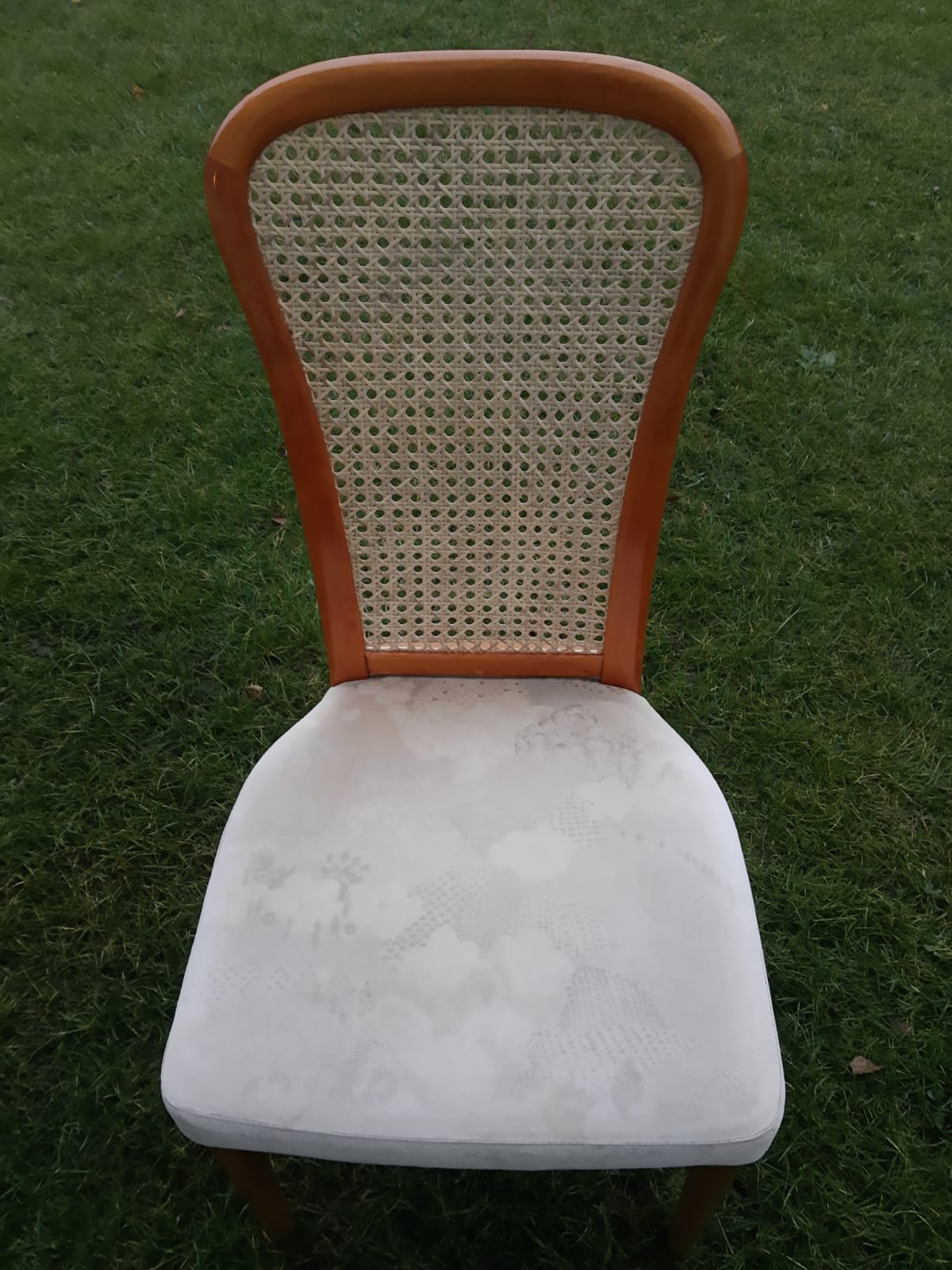 In diesen Stuhl wurde traditionell ein Wiener Geflecht eingearbeitet. Hierbei musste die Besonderheit, dass die Sitzfläche keine Eckbohrungen hat, berücksichtigt werden. Die beiden Diagonalen, die eigentlich in dem Eckloch beginnen bzw. enden, werden auf die Nebenlöcher verteilt (Siehe Detailaufnahme). Es werden keine Ecklöcher gebohrt. Das Material wurde in diesem Fall trocken verarbeitet, weil dir Luftfeuchtigkeit gerade entsprechend hoch ist.