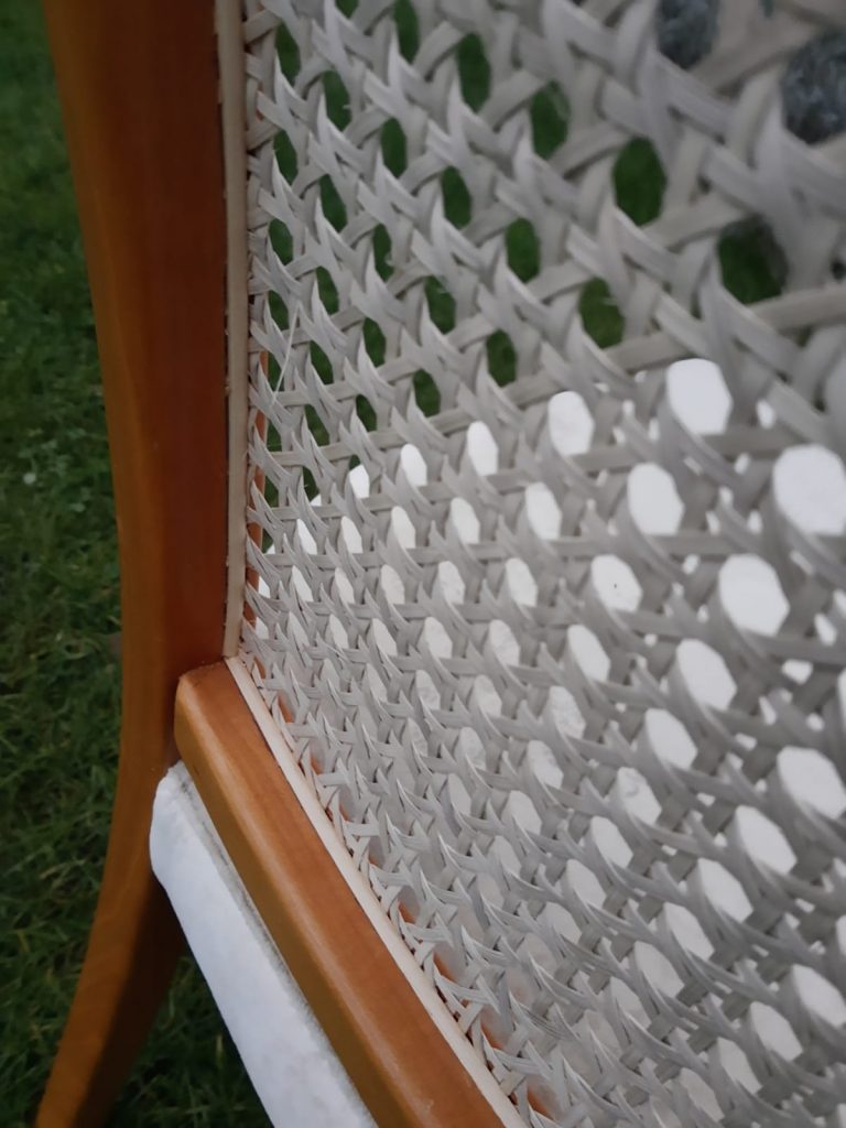 Das Originalgeflecht hatte eine Materialbreite von 2,7cm. Dies wurde wieder entsprechend angeglichen. Die Abstände wurden auf einen Holzrahmen übertragen. Auf diesem Rahmen wurde das Wiener Geflecht mit entsprechendem Material gefertigt. Da im Herbst die Luftfeuchtigkeit des Raumes, in dem ich flechte, sehr hoch ist, muss das Material während des Flechtvorgangs nicht angefeuchtet. Vorsichtig löste ich das alte Geflecht, das mit einem Nut-Federsystem in die Lehne von hinten eingearbeitet wurde. Die von mir gefertigte Geflechtmatte schnitt ich nach dem Muster der Geflechtreste zu. Da ich mir, um die entsprechende Spannung der fertigen Lehne zu erhalten, die Eigenschaft des Materials, während des Trocknungsprozesses zu schwinden, zu nutze machen muss, verarbeite ich das Material feucht. Die Geflechtmatte wurde mittels verschiedener Keile in der Nut verklemmt und mit einer Feder aus Peddigrohr verleimt.