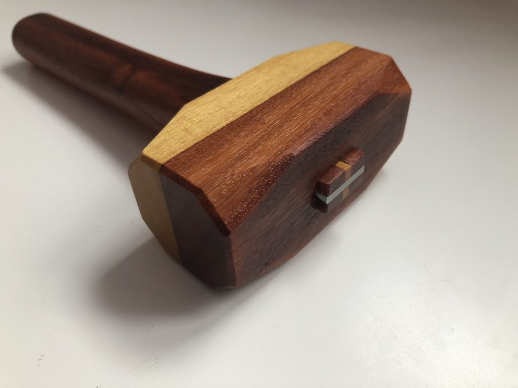 Der Kopf des Holzhammers besteht aus Cumaru und Garapa, der Stiel aus Cumaru. Alle Fasen, sowie der Steil wurden mit Stechbeiteln in die entgültige Form gebracht. Die Fixierung des Kopfes erfolgte über zwei Keile aus Garapa und Edelstahl. Die Schleifarbeiten erfolgten mit dem Festool ETS EC 150/3 EQ.