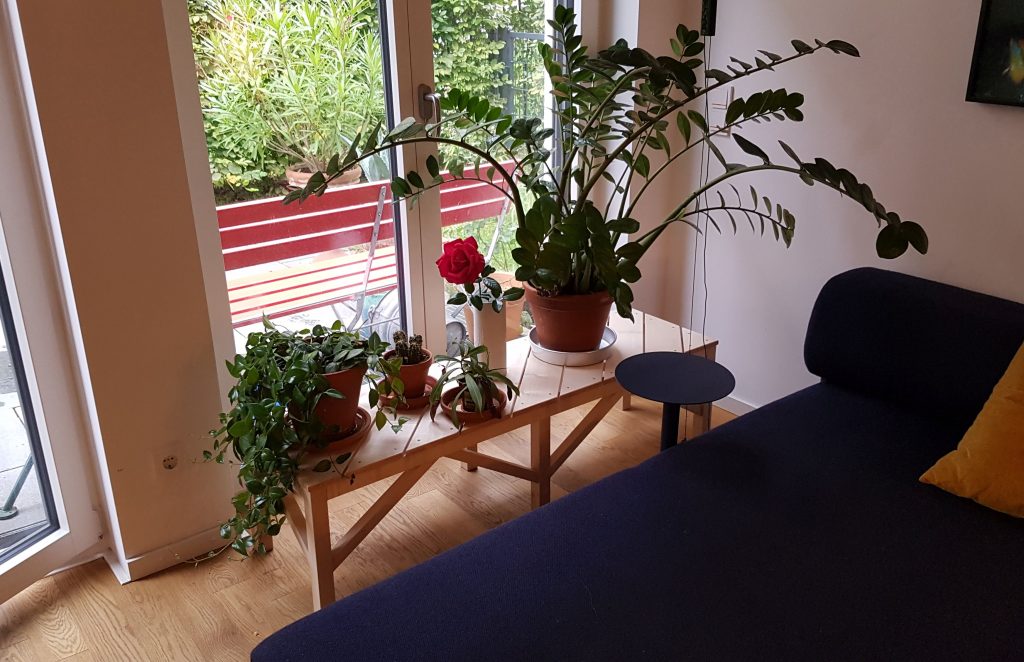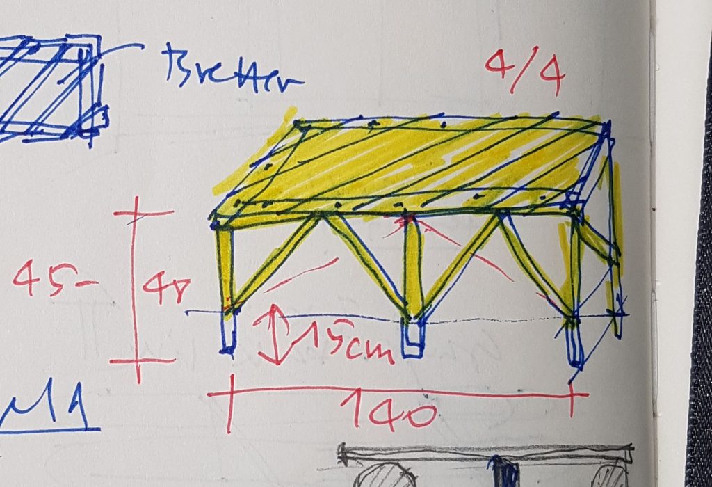 Freunde wünschten sich eine niedrige Bank, auf der verschiedene Pflanzen Platz finden sollten. Das Design sah sechs Beine vor, die in der Art von Kopfbändern dekorativ verstrebt sein sollten. Das verwendete Ahornholz war vor Jahren im Sägewerk geschnitten worden und wurde nun maschinell auf die gewünschten Querschnitte gebracht.
