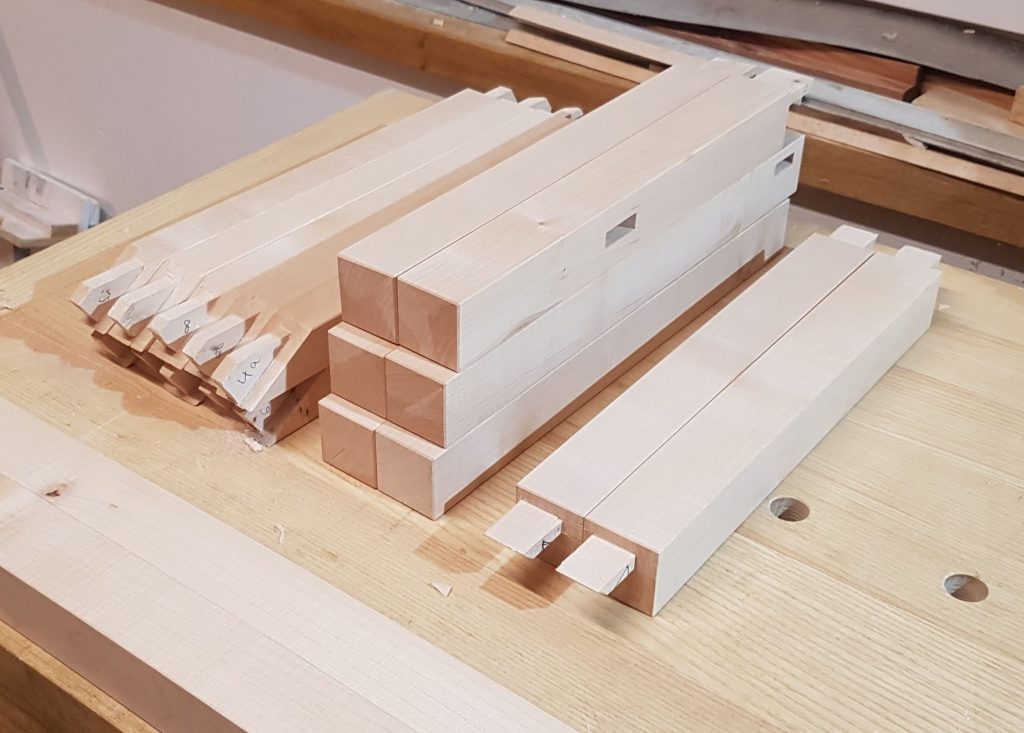 Sämtliche Verbindungen wurden dann von Hand als Schlitz- und Zapfenverbindungen hergestellt. Vor dem Zusammenbau wurden alle Teile händisch gehobelt. Die Befestigung der Deckfläche erfolgte mit dekorativ, mit sichtbaren Schrauben und von oben.