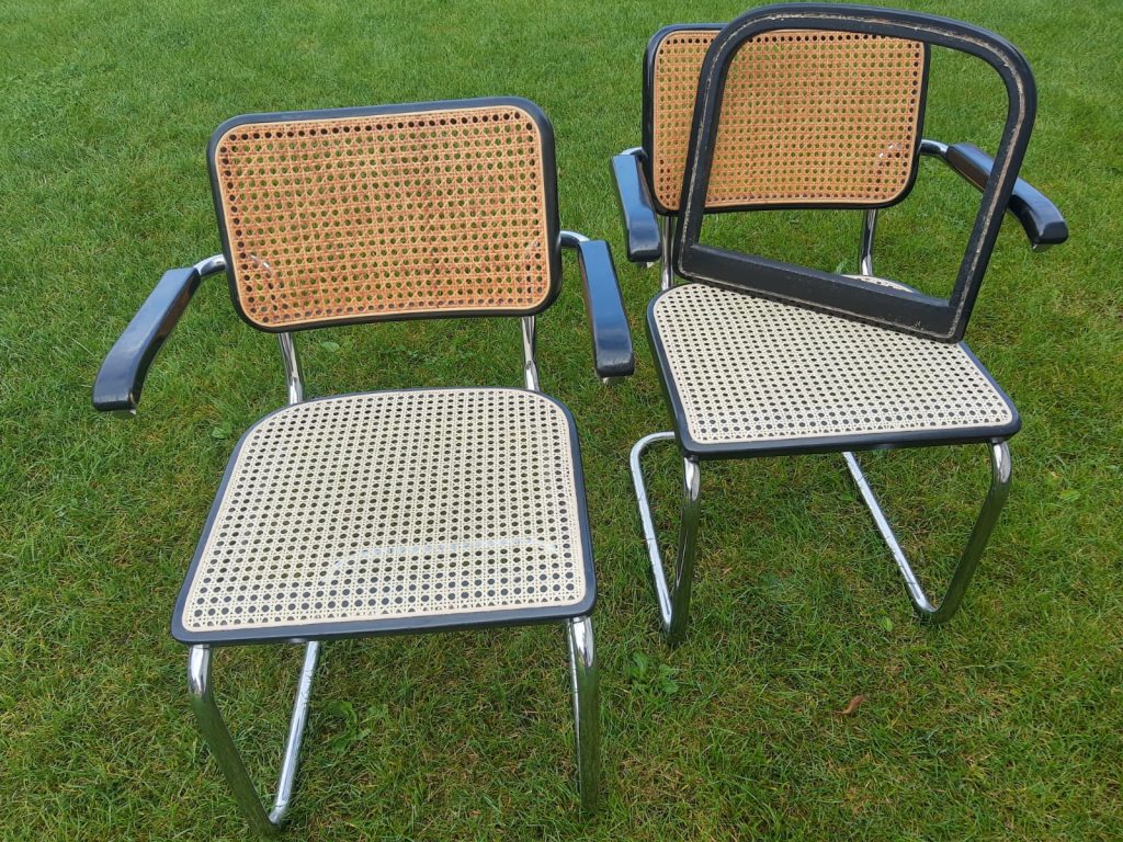 Thonet produziert diesen Stuhl nach dem Entwurf von Marcel Breuer. Eine Stahlrohrkonstruktion in Verbindung mit Sitzfläche und Lehne. Das Wiener Geflecht ist in diesem Fall mit einem Nut-/Federsystem eingeleimt. Die Nut kann vorsichtig mit dem Foredom Schnitzaufsatz geöffnet werden. Dann muss eine neue Geflechtmatte eingeleimt werden. Diese wird im feuchten Zustand verarbeitet. Um eine möglichst hohe Qualität zu erreichen, spanne ich die Geflechtmatte vor der Verarbeitung auf einen Rahmen und tausche z.B. gespaltenes Rohr aus. Material und Werkzeug: Geflechtmatte, Peddigrohrschiene, Keile, Leim, Polsterhammer, Schraubzwingen.