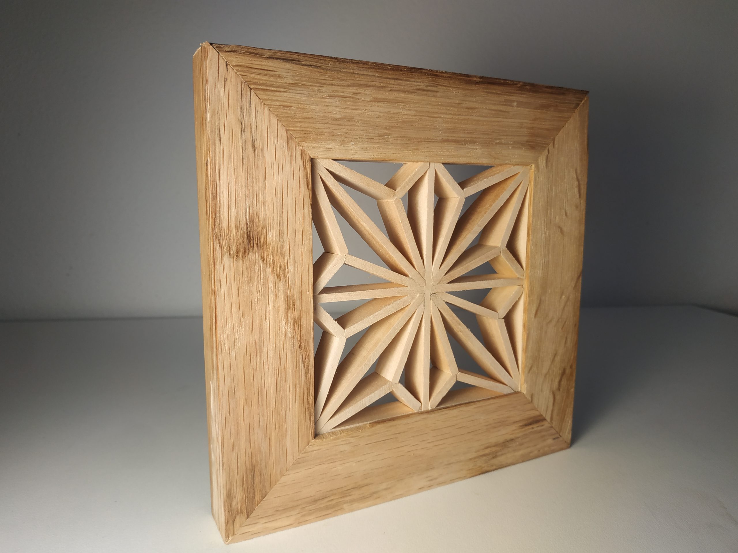 Dieses kleine Kumiko-Panel habe ich aus Linde hergestellt und einen dekorativen Rahmen dafür aus recycelter Eiche hergestellt. Die Gehrungen des Rahmens wurden mit der Dozuki Japansäge grob vorgearbeitet und dann mit dem Stanley no.5 in der Gehrungs-Stoßlade passend bestoßen. Oberflächenbehandlung des Rahmens erfolgte mit Leinölfirnis, das Kumiko-Panel ist unbehandelt.