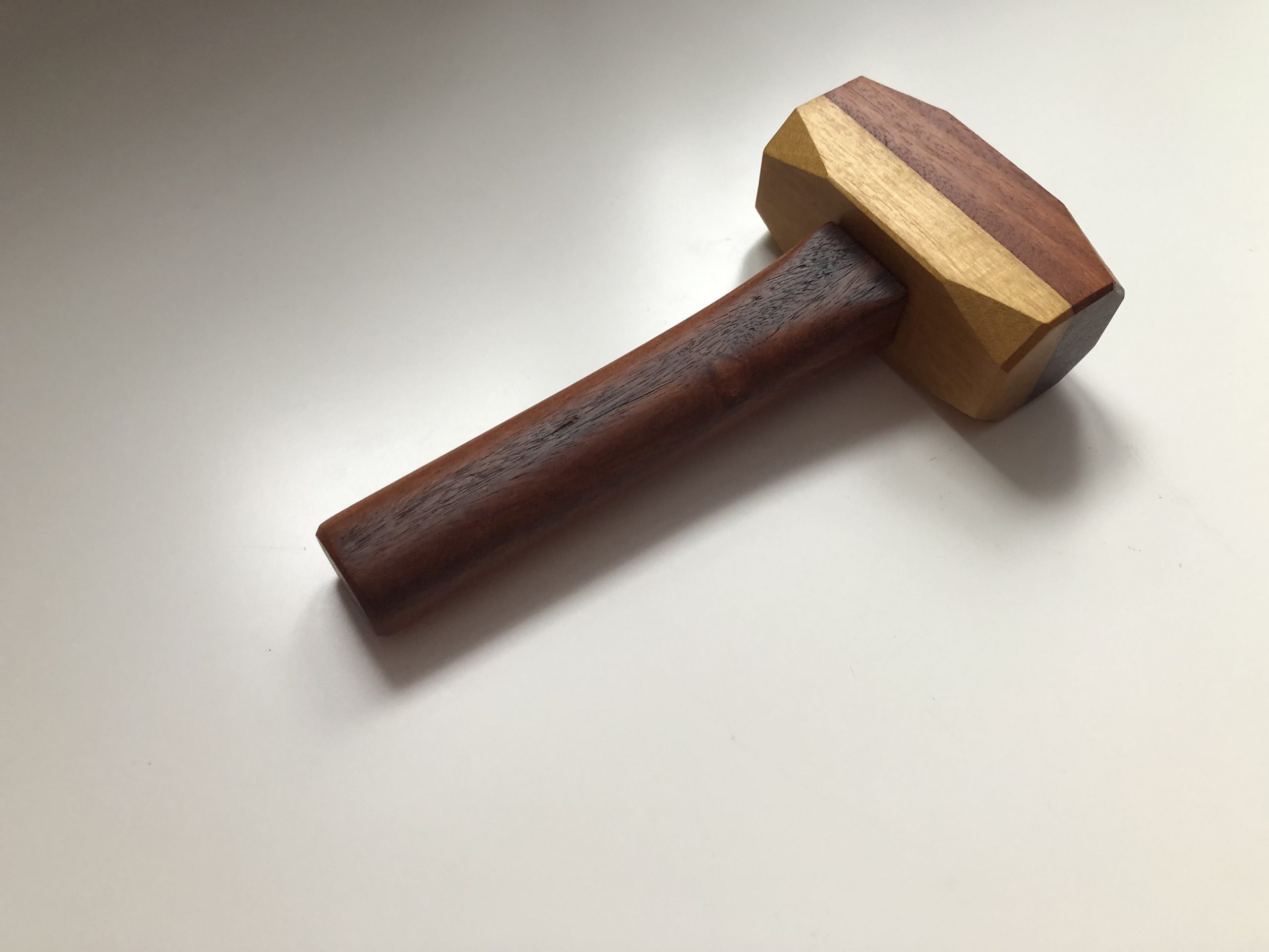Der Kopf des Holzhammers besteht aus Cumaru und Garapa, der Stiel aus Cumaru. Alle Fasen, sowie der Steil wurden mit Stechbeiteln in die entgültige Form gebracht. Die Fixierung des Kopfes erfolgte über zwei Keile aus Garapa und Edelstahl. Die Schleifarbeiten erfolgten mit dem Festool ETS EC 150/3 EQ.