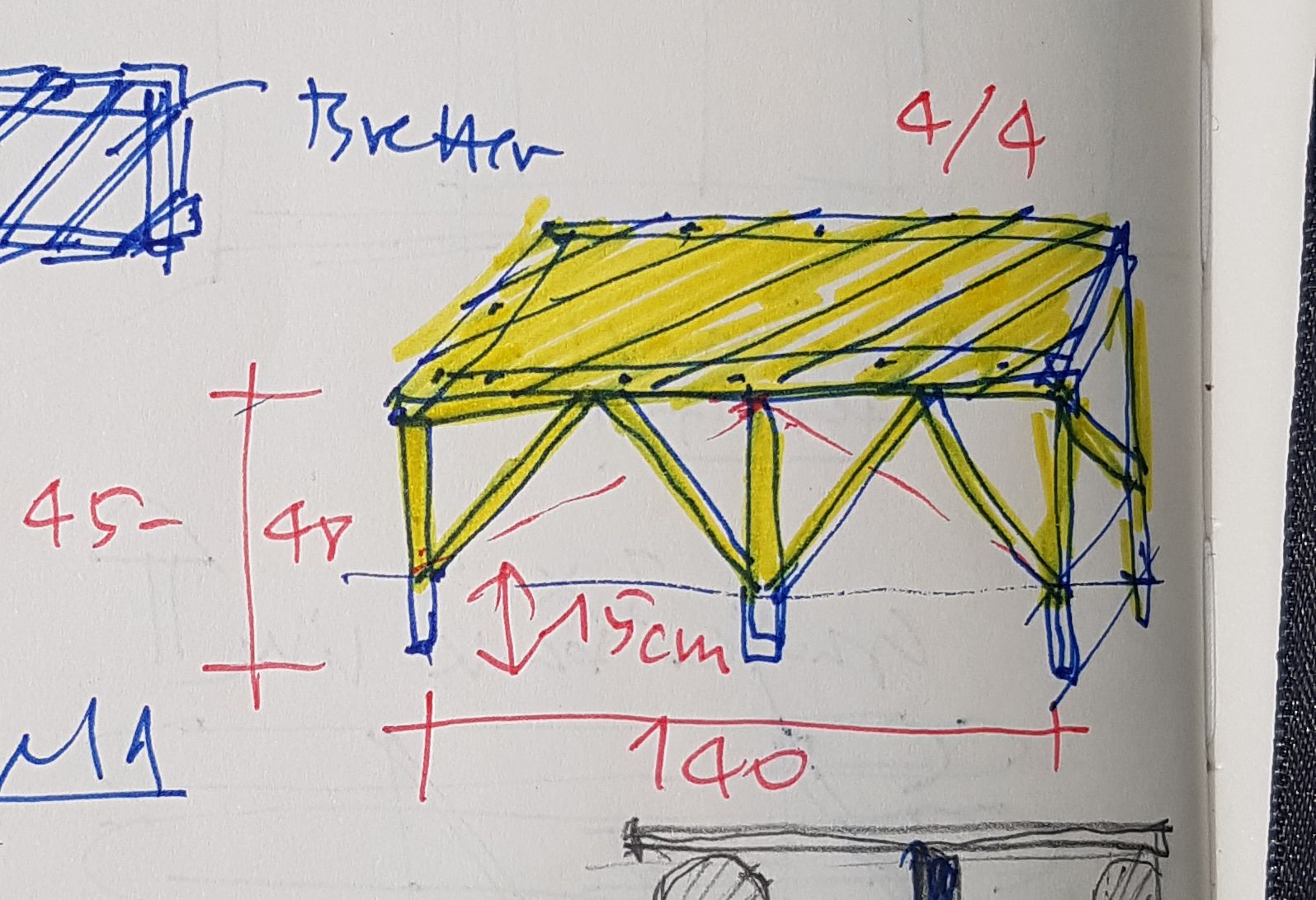 Freunde wünschten sich eine niedrige Bank, auf der verschiedene Pflanzen Platz finden sollten. Das Design sah sechs Beine vor, die in der Art von Kopfbändern dekorativ verstrebt sein sollten. Das verwendete Ahornholz war vor Jahren im Sägewerk geschnitten worden und wurde nun maschinell auf die gewünschten Querschnitte gebracht.