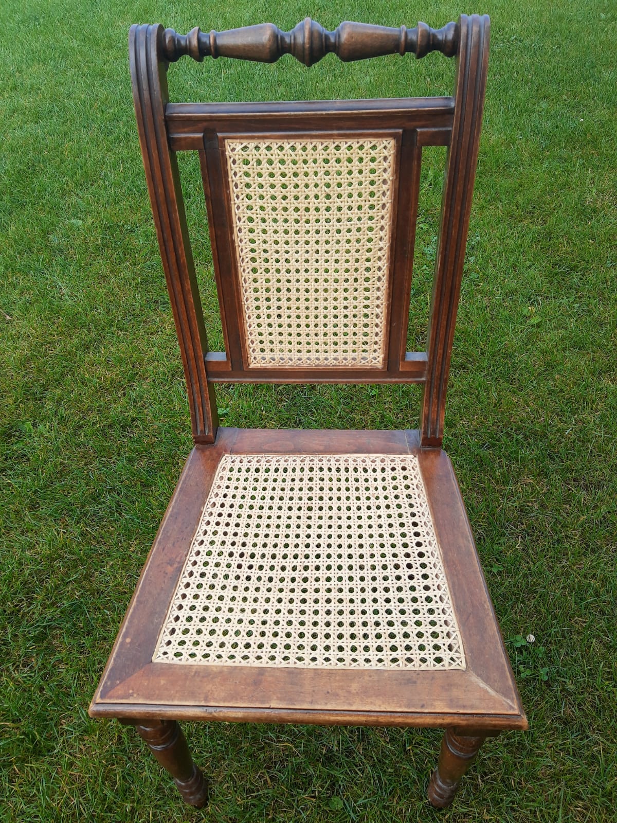 Material: Stuhlflechtrohr 2,0mm für die Längs- und Querschichten Stuhlflechtrohr 2,2mm für die Diagonalen Stuhlflechtrohr 3,3mm für die Umrandung. Werkzeug: Polsterhammer, spitze Ahle, flach gebogene Sattlerahle, Kombizange, Haltekeile, Hautleim, Holznägel. Das Geflecht wird schrittweise in die Sitzfläche eingezogen und verknotet. Bei der Lehne wird das Geflecht mit Hautleim eingeleimt. Sowohl bei der Sitzfläche als auch der Lehne werden erst Spannschichten eingezogen, die die Basis für das Geflecht bilden. Erst danach kann geflochten werden. Das Material wird feucht verarbeitet.