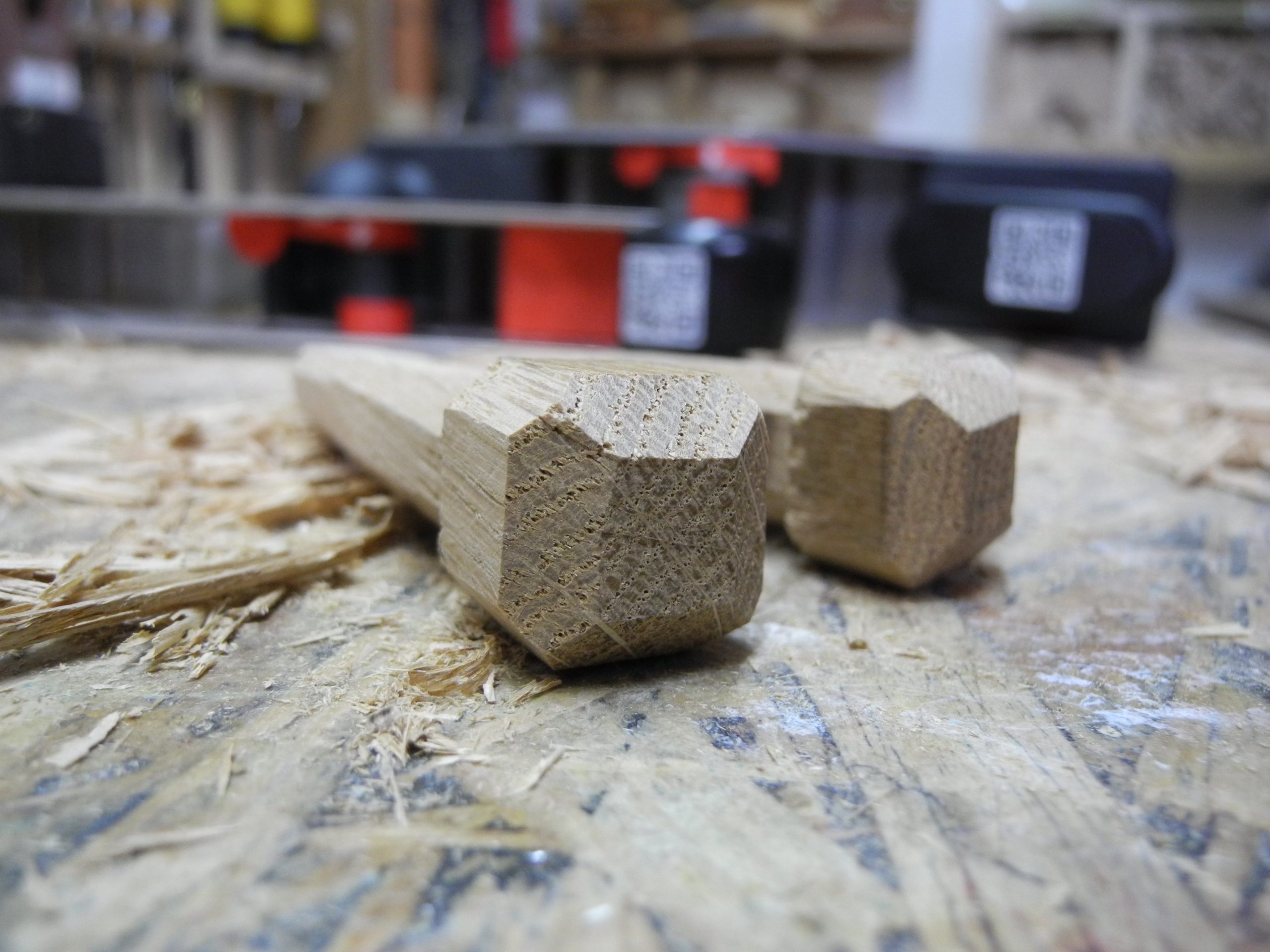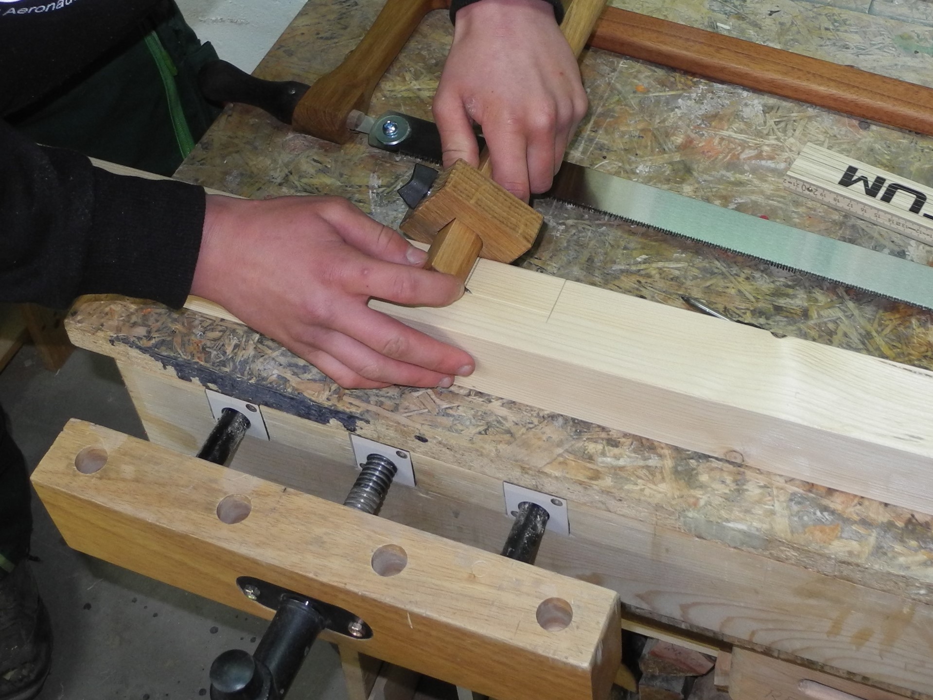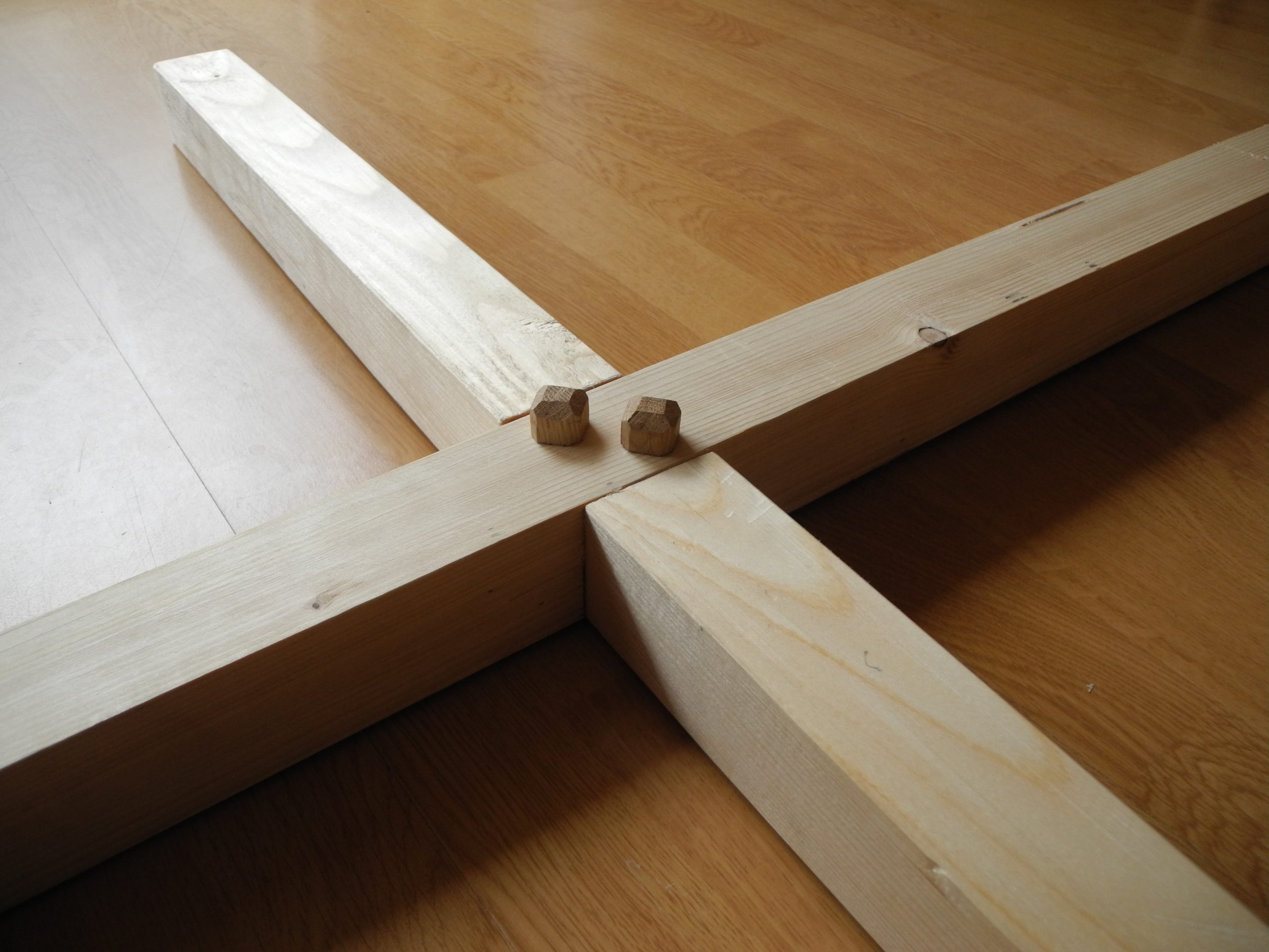 Ich habe mich entschieden hierfür nur traditionelle Fertigungstechniken zu verwenden. So richtete ich das sägeraue Holz zunächst mit der Rauhbank ab. Anschließend wurde die Kreuzüberblattung mit der Gestellsäge eingesägt und mit dem Zimmermannsbeitel ausgestemmt.