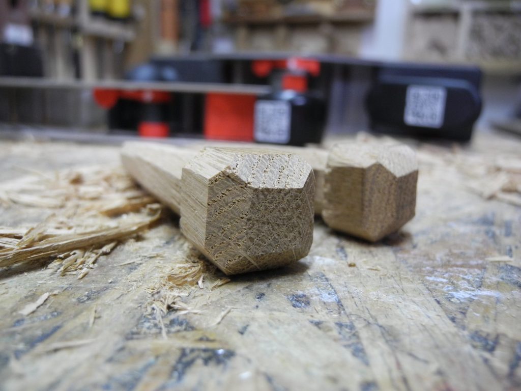 Mit der Stoßaxt verputzte ich den Nutgrund vor dem Zusammenpressen der Holzverbindung. Da ich keinen Leim verwenden wollte, sicherte ich die ohnehin schon stramm sitzende Holzverbindung mit zwei handgemachten Dollen. Diese wurden aus einem Eichebohlen mit der Gestellsäge, einem Simshobel und einem Stemmeisen herausgearbeitet.