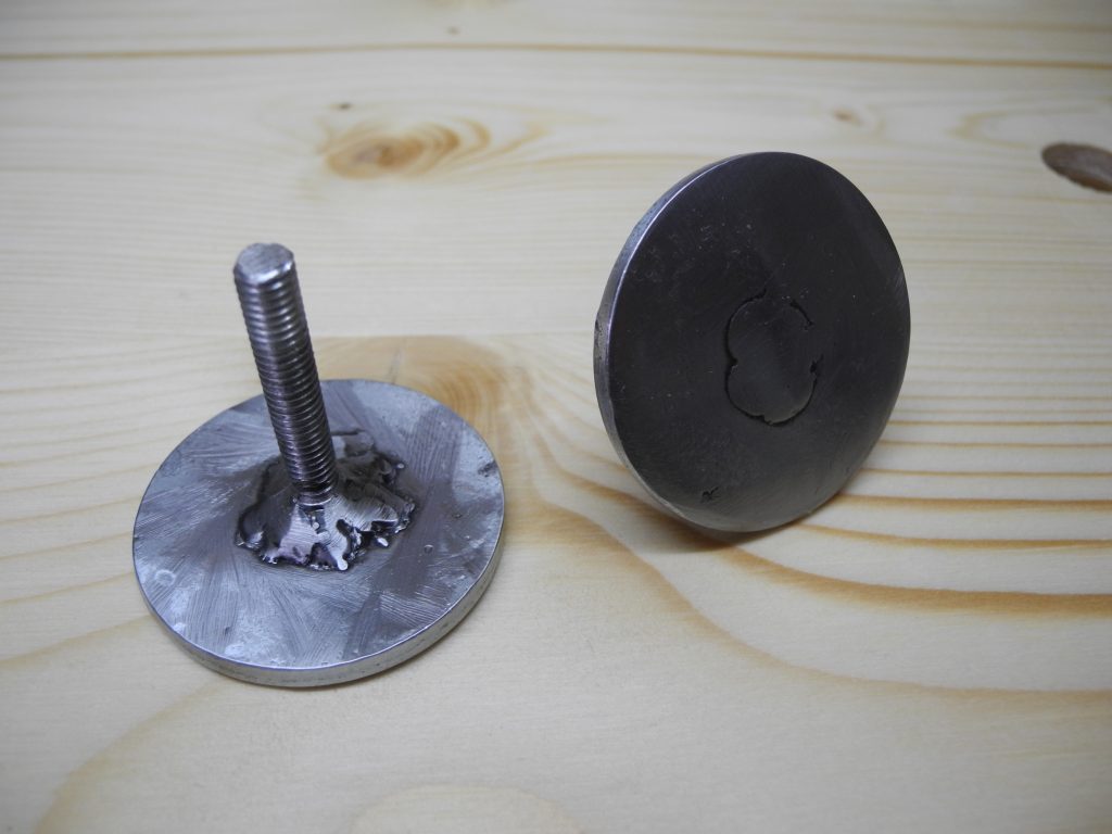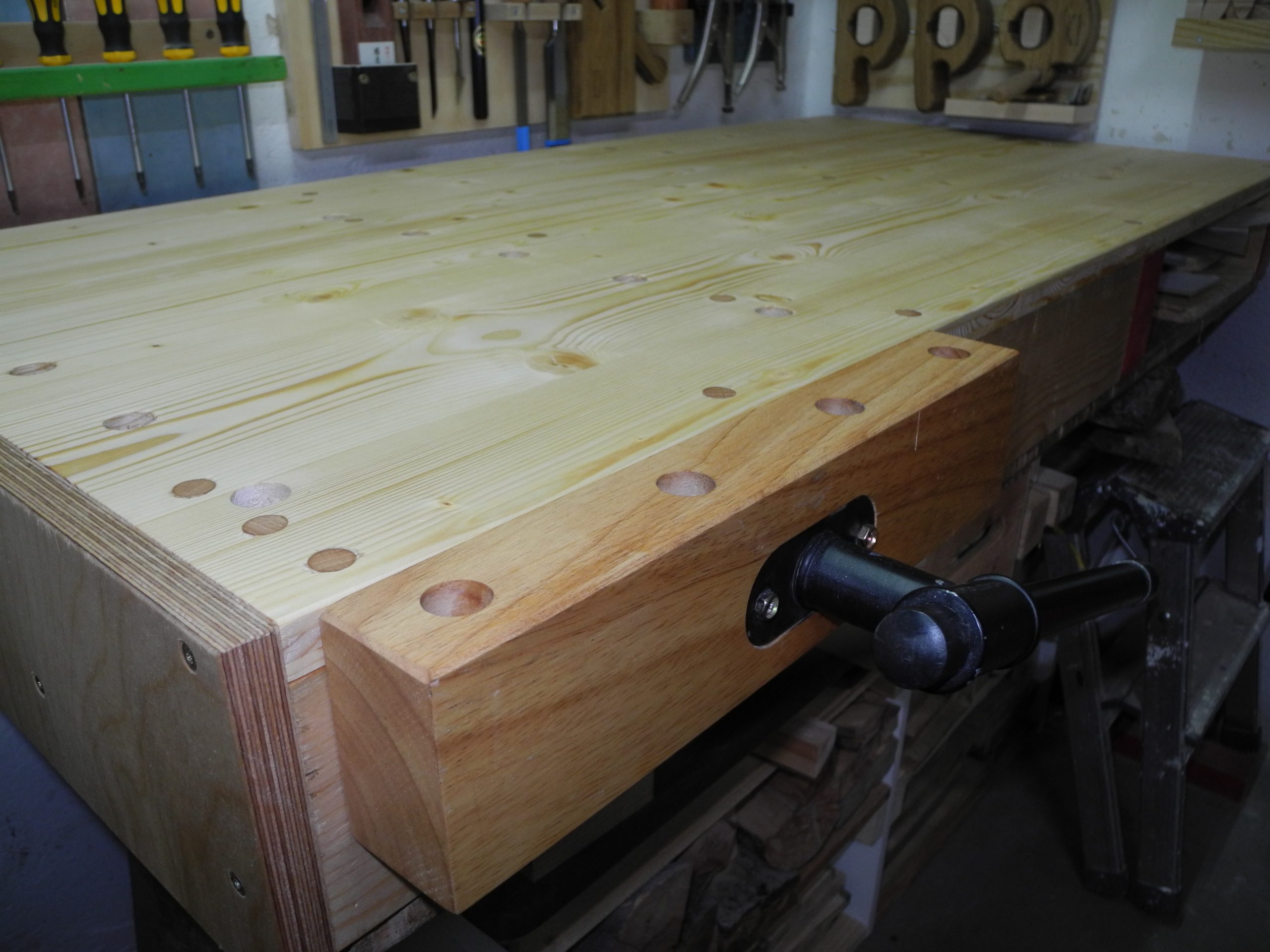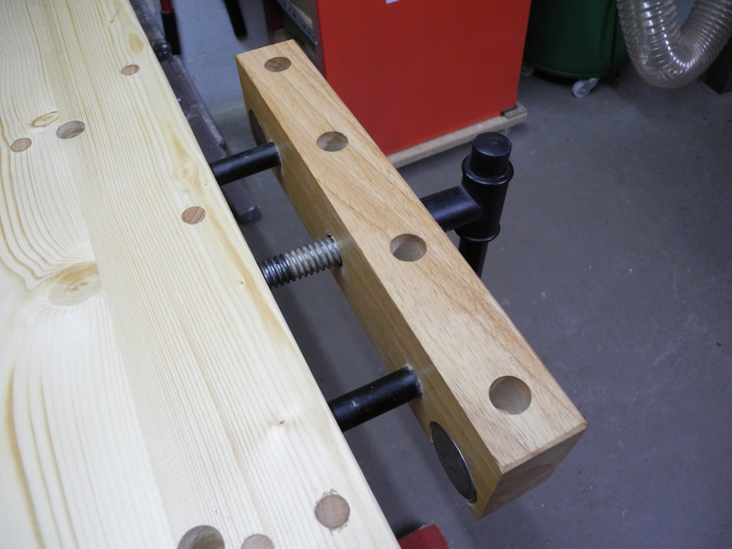 Meine Bankzange ist über die Jahre der intensiven Verwendung ziemlich ausgeschlagen, sodass sie nicht mehr sauber parallel zur Hobelbank spannt. Nachdem ich die Laufschienen erneuert habe und das Spiel immer noch zu groß war, ist mir eine Idee zur einfachen Verbesserung der Bankzange gekommen: Aus einer großen Unterlegscheibe und einer Gewindeschraube schweißte ich überdimensional große Rändelschrauben. Im unteren Bereich der Spannzange bohrte ich zunächst mit dem 50er Forstnerbohrer eine Vertiefung, anschließend habe ich ein Einschraubgewinde mittig eingebracht, in dem die Rändelschraube läuft. Nun kann – sollte ein starker Anpressdruck benötigt werden – die Rändelschraube rausgedreht werden, liegt dann an der Hobelbank an und hält die Bankzange parallel.