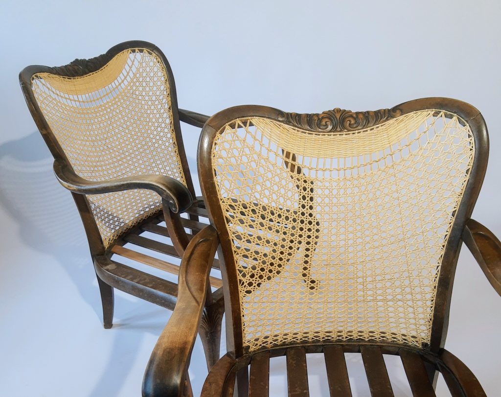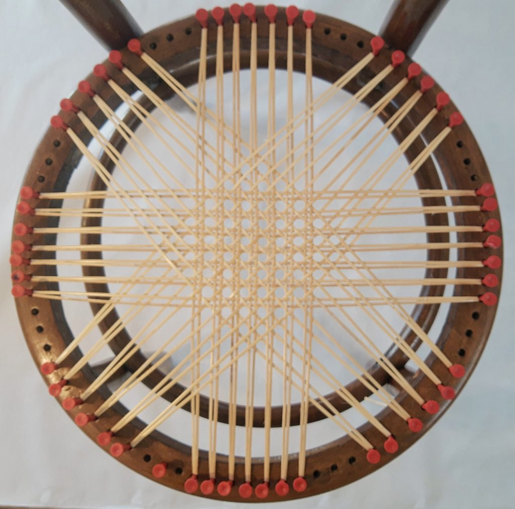 Die Lehne dieses Bugholzstuhls der Firma Kohn war erhalten, die Sitzfläche wurde rekonstruiert. Das Geflecht wurde hier nicht durch Bohrungen gezogen, sondern auf einen Einlegerahmen genagelt. Aufgrund der Nagelspuren und des bestehenden Geflechts der Lehne konnten die Abstände der Flechtrohre dem Original nachempfunden werden. Sowohl die Farbanalyse, das Färben der Rohre, als auch das Flechten hat das Bayerische Fernsehen dokumentiert.