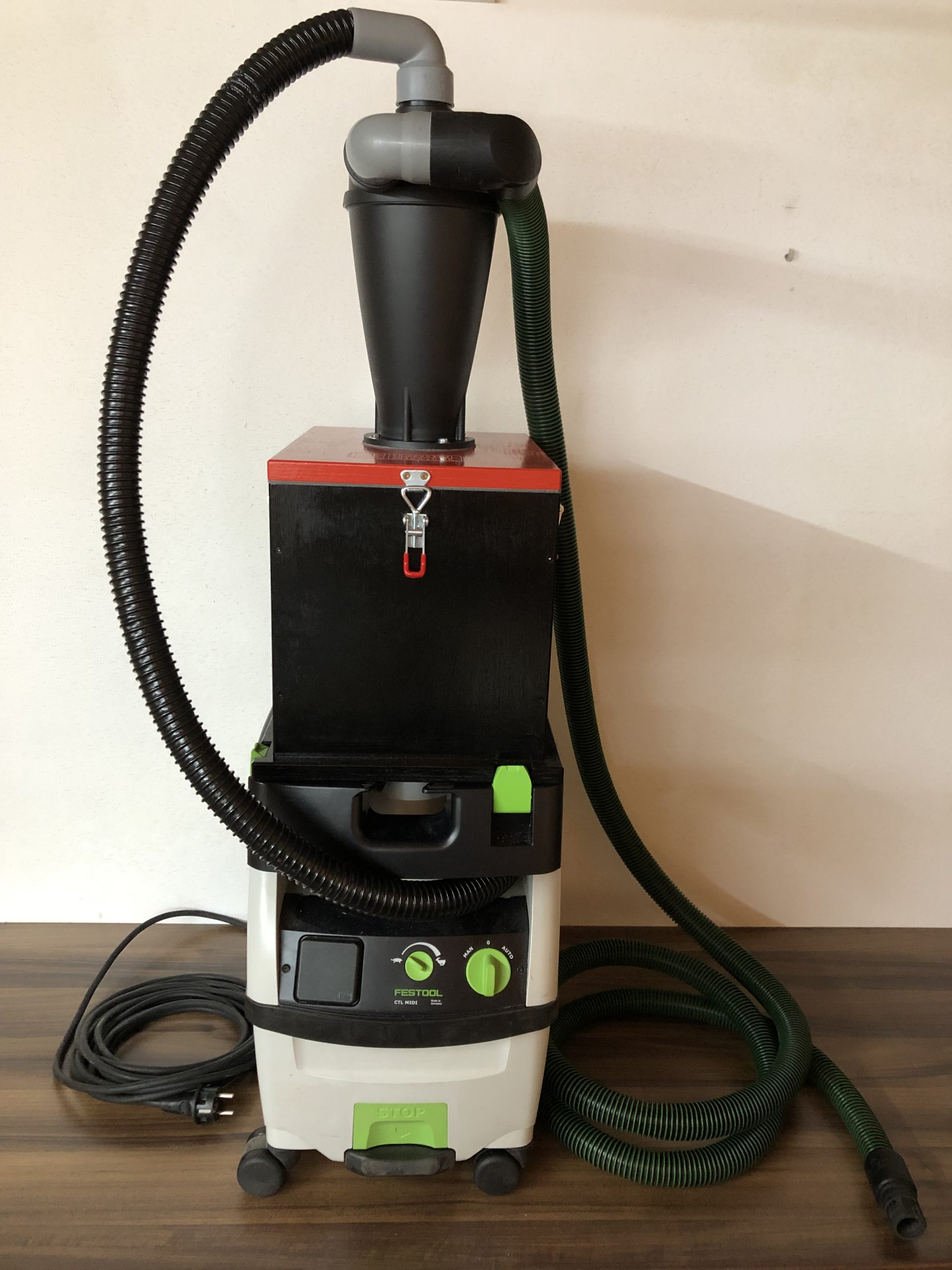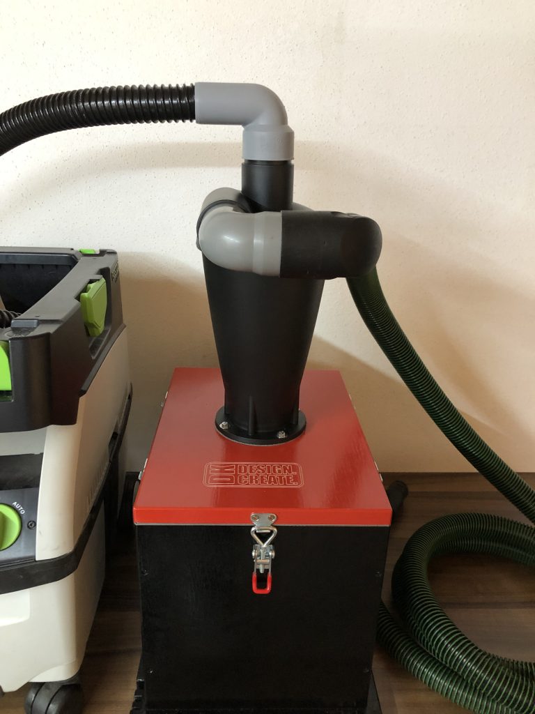 Der Behälter besteht aus Buche Multiplex, die Verrohrung sind handelsübliche HT-Rohre. Der Boden des Behälters wurde mit Stechbeiteln so ausgearbeitet, dass die Festool Systainerverschlüsse genutzt werden können. Verschlossen wird der Behälter mit Hilfe von Kniehebelspannern. Die Sägearbeiten erfolgten mit dem Festool TS 55 R-Set.
