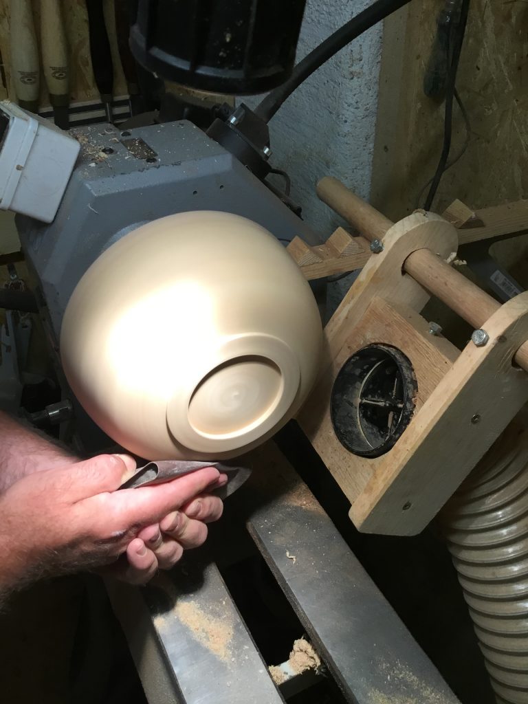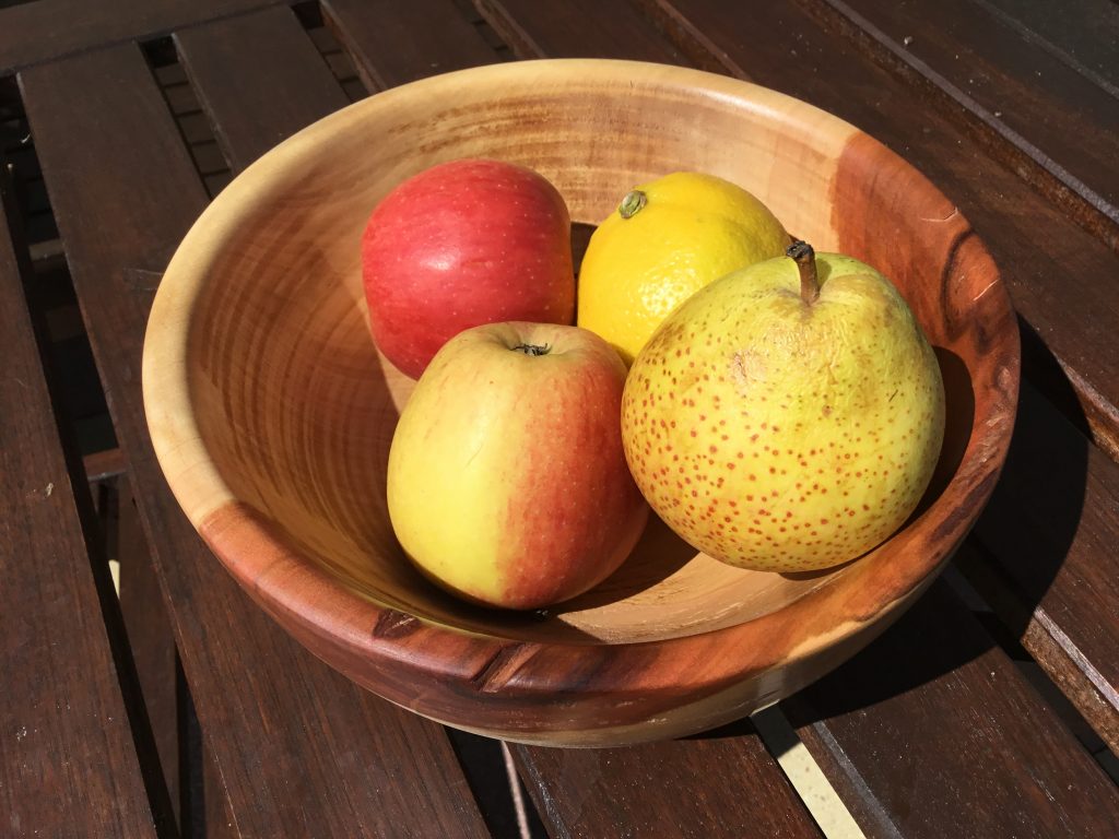 Die Schale wurde aus dem Holz eines Kirschbaum gedrechselt. Sie hat einen Durchmesser von ca. 20 cm. Die Oberfläche wurde bis Körnung 400 geschliffen und abschließend mit Danish Oil behandelt.