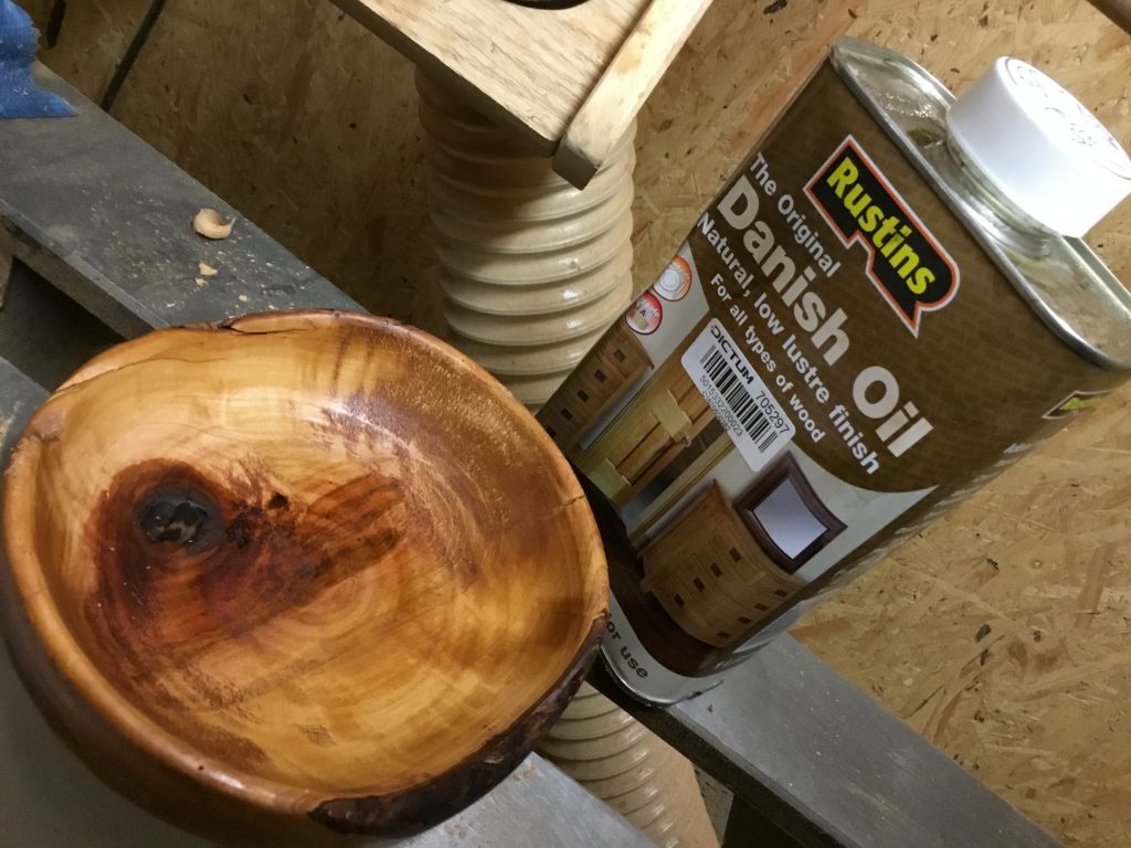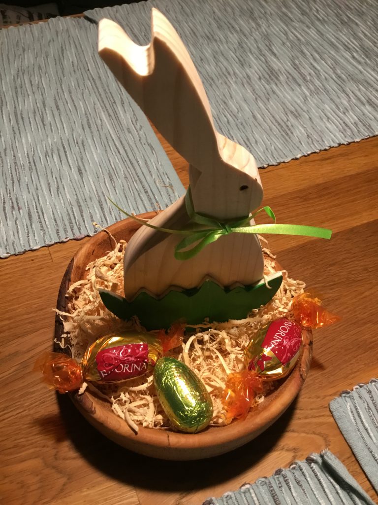 Das Osternest wurde aus Kirschholz gedrechselt, anschließend bis Körnung 400 geschliffen und zum Schluss wurde die Oberfläche mit Danish Oil behandelt. Der Osterhase wurde aus einem Leimholzbrett mit der Dekupiersäge von Hegner ausgeschnitten.