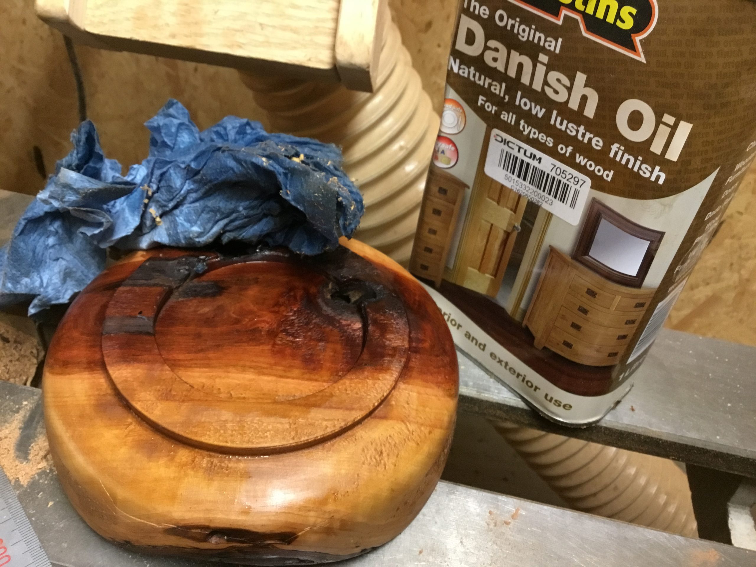 Das Osternest wurde aus Kirschholz gedrechselt, anschließend bis Körnung 400 geschliffen und zum Schluss wurde die Oberfläche mit Danish Oil behandelt. Der Osterhase wurde aus einem Leimholzbrett mit der Dekupiersäge von Hegner ausgeschnitten.