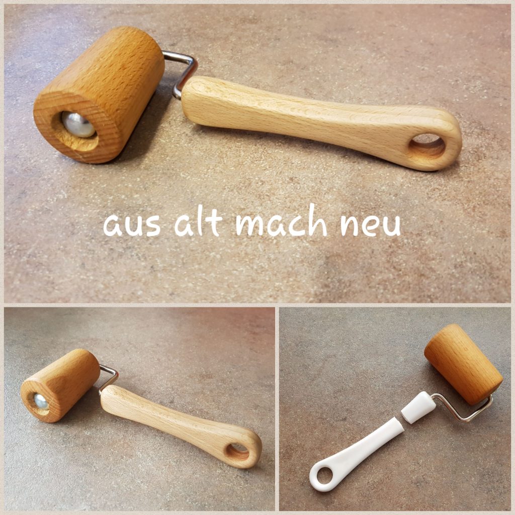 Ganz nach dem Motto „aus alt mach neu“ habe ich den abgebrochenen Kunststoffgriff meines Teigrollers neu aus Buchenholz angefertigt. Mit Hilfe des alten Griffs habe ich die Form auf ein Buchenstück übertragen, dass ich noch in meiner Restekiste hatte. Ausgearbeitet wurde der Griff mit einer Raspel und Feile. Das Griffloch habe ich mit einen Forstnerbohrer gebohrt und die Kanten mit einen Fräser abgerundet. Im Anschluss wurde die Oberfläche noch glatt geschliffen und mit Leinöl zwei mal eingeölt.