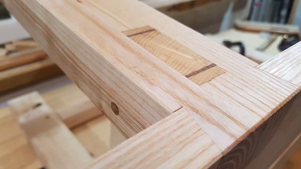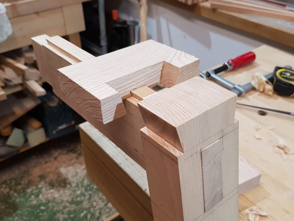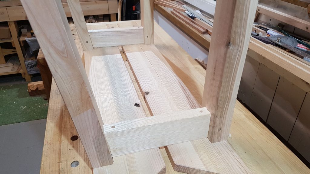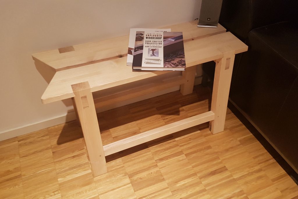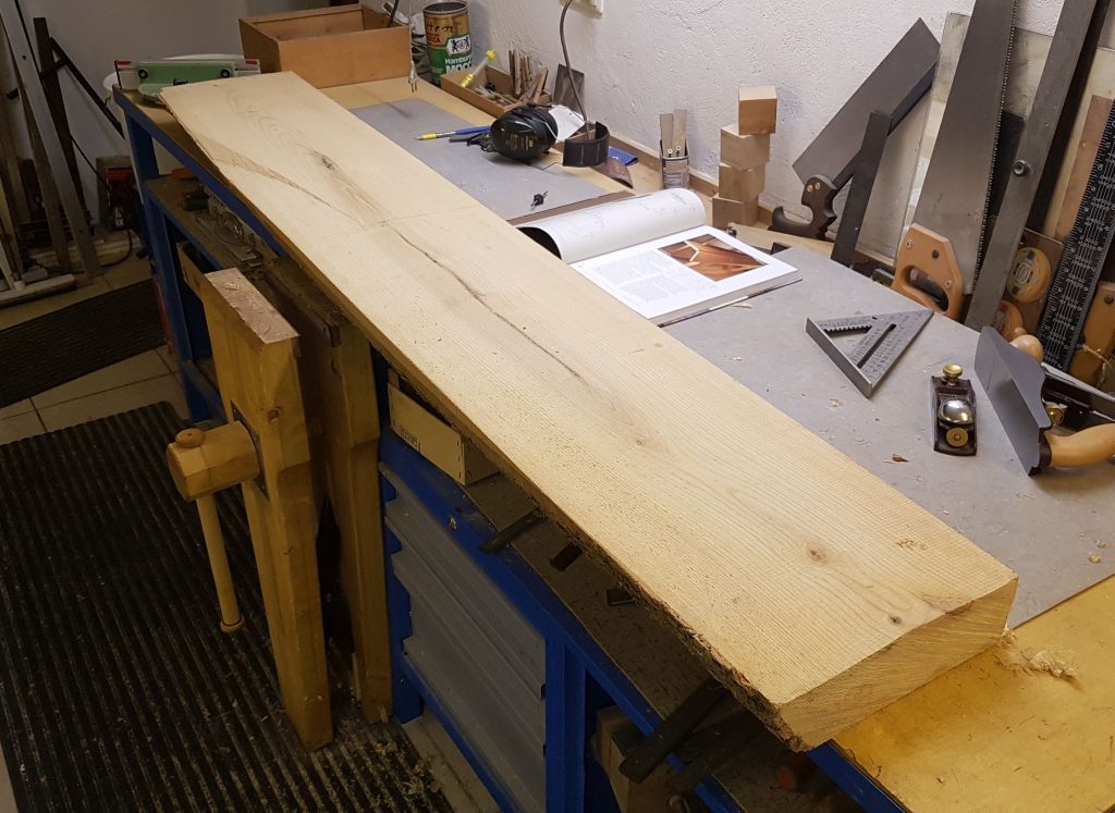 Um Bretter von Hand zu besäumen ist eine Sägebank erste Wahl. Die Haltung ist ergonomisch und der Schnitt läßt sich leicht geradeaus steuern. Ich fertigte mein Exemplar in Anlehnung an die Version von Tom Fidgen aus seinem Buch „The unplugged Woodshop“ aus dem DICTUM-Bücherangebot. Als Material stand eine Bohle aus Esche zur Verfügung, die maschinell aufgetrennt, abgerichtet und auf Stärke gehobelt wurde. Beine und Zargen wurden anschließend mit Schlitz (teilweise durchgestemmt) und Zapfen verbunden. Die Oberseite wurde mit einer Grat-Verbindung an den Beinen und den oberen Zargen befestigt und von unten mit Dübeln gesichert. Alle Verbindungen wurden, schon um den Zusammenbau zu erleichtern, auf Zug verdübelt und teilweise verkeilt. Als Werkzeuge kamen asiatische und westlich Handsägen, Stemmeisen, Streichmaße, Handhobel, Grathobel und vieles mehr zum Einsatz. Die Dübel wurden mit der Dübelplatte von Lie Nielsen aus Eiche hergestellt.