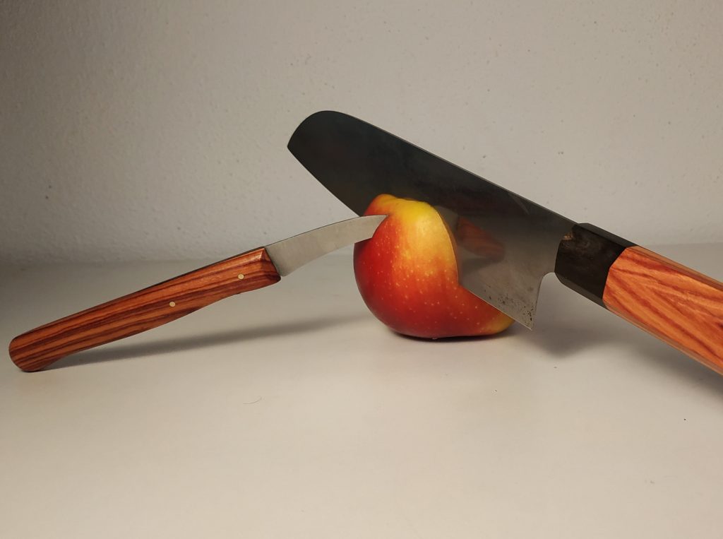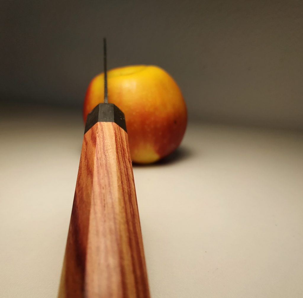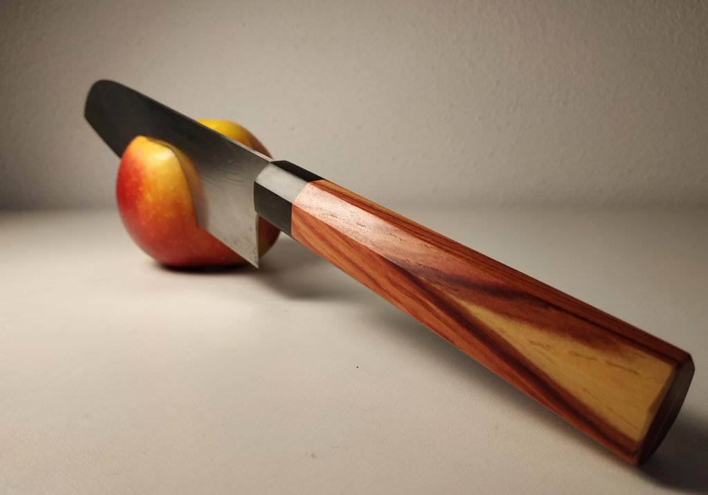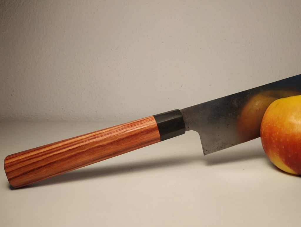 Dieses Santoku eines deutschen Herstellers, das ursprünglich einen westlichen Griff hatte, habe ich auf einen Wa-Griff umgebaut. Dazu musste zunächst die Flachangel zur Steckangel modifiziert werden, der Griff wurde dann aus Bahia Rosenholz und schwarzem Büffelhorn gefertigt. Mit der Shinto-Raspel und mehreren Feilen wurde der Griff dann in die achteckige Form gebracht und im Anschluss bis Körnung 60/ geschliffen und poliert. Oberflächenbehandlung erfolgte mit Danish Oil und Bienenwachs. Aus dem Restholz des Blocks Rosenholz konnte ich anschließend sogar noch einen Griff für ein kleines Schälmesser herstellen.