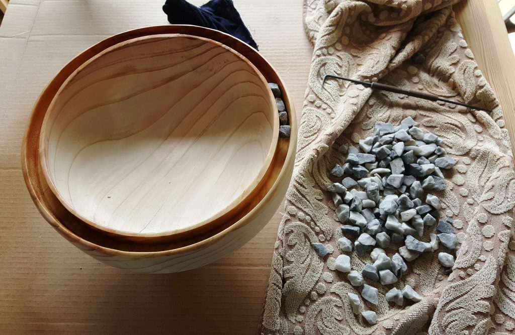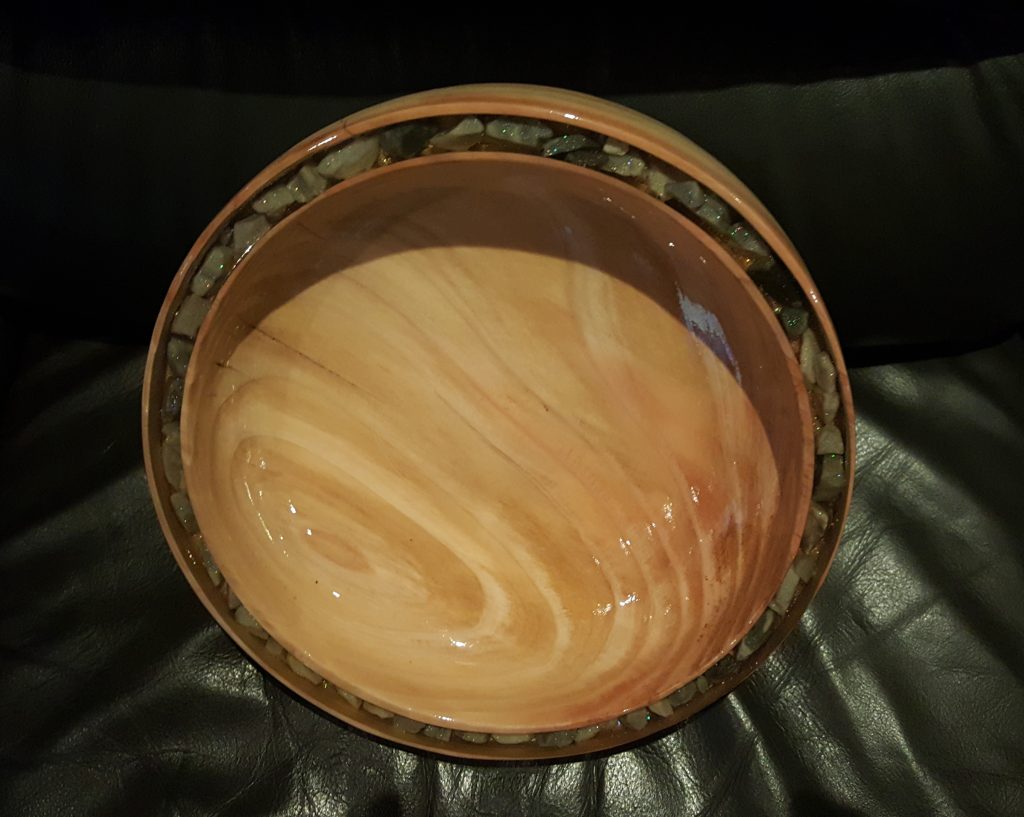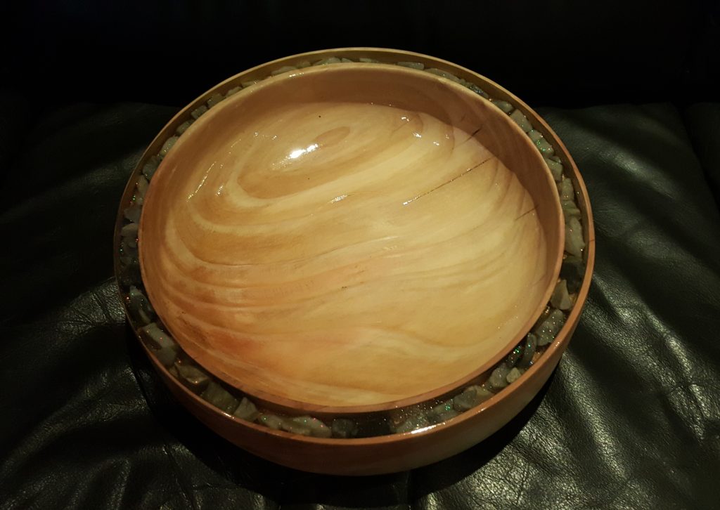 Das Holz des Mammutbaumes macht seinem Namen alle Ehre. Die Maserung ist ebenso wie die Fasern sehr grob strukturiert. Deshalb ist es sehr schwierig mit diesem Holz zu arbeiten, allerdings ist es auch eine interessante Erfahrung und Herausforderung. Die Schale hat einen Durchmesser von 270 mm und eine Höhe von 80 mm. Im Rand ist eine Einlage aus Kieselsteinen eingearbeitet und mit einer Epoxidmischung mit Diamanteffekt verarbeitet.