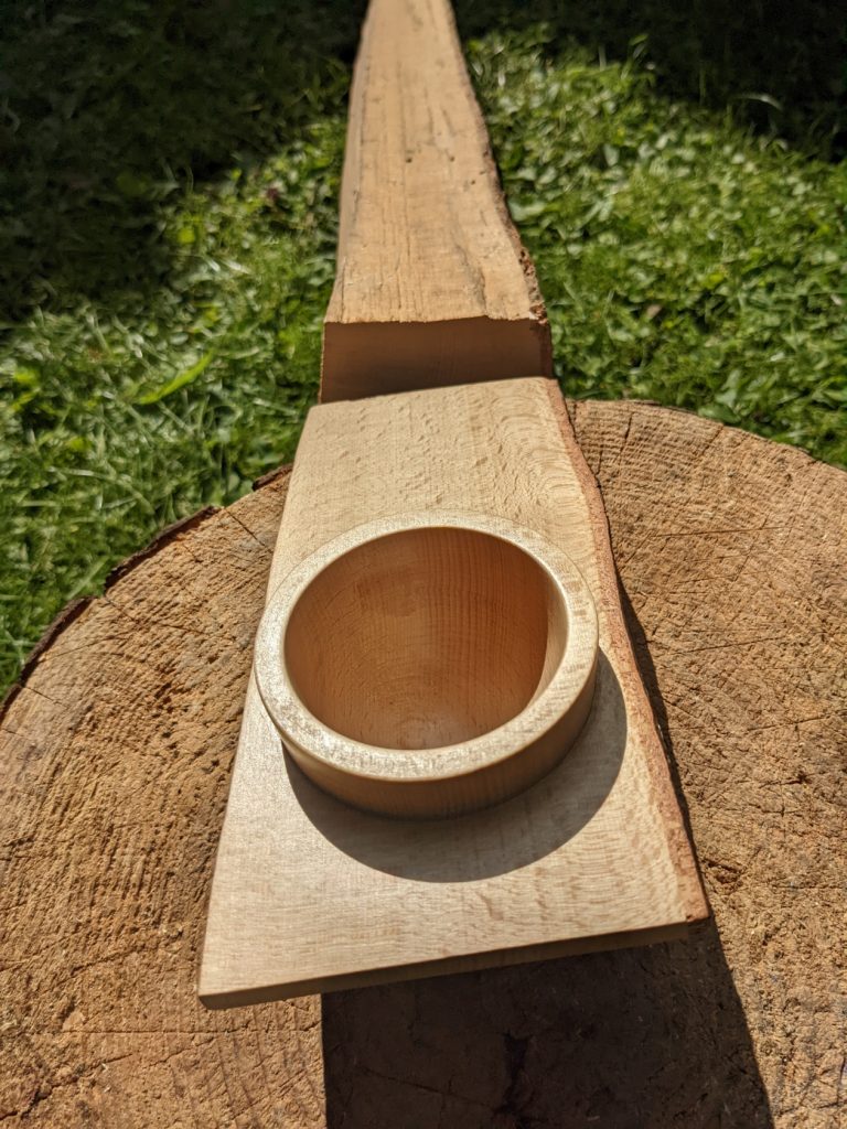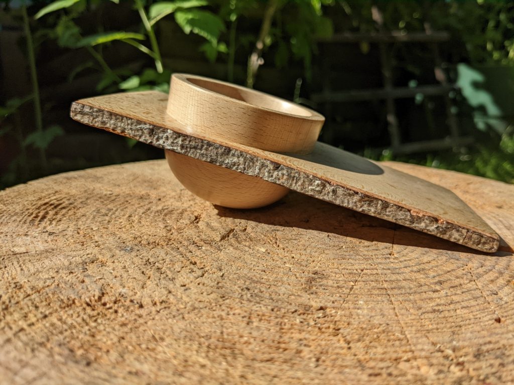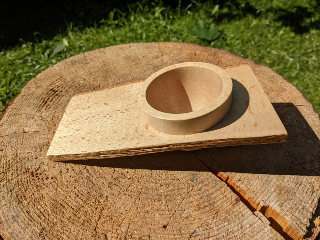 Aus einem Youtube-Video mit Stuart Batty wolle ich diesen Stil an Schale einmal ausprobieren. Aus einem Buchenholz-Block habe ich zuerst die gröbsten Abfallstücke per Hand ausgesägt, und dann die Schale gedrechselt. Ein recht herausforderndes Projekt, speziell auf dem „Brett“ war es schwierig ein gutes Finish hinzubekommen. Interessant ist auch, das das „Brett“ mit einem perfekt geraden Schnitt gedrechselt wurde, es im Profil aber gebogen aussieht. Oberflächenbehandlung mit Schellack, Sanding Sealer und Hartöl.