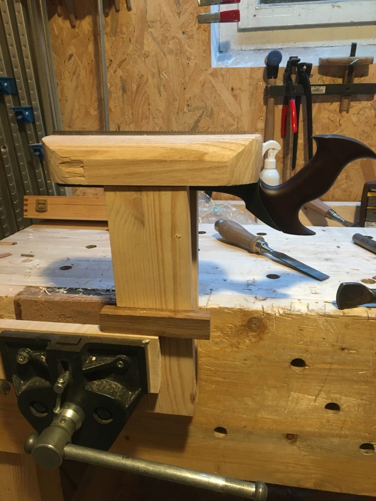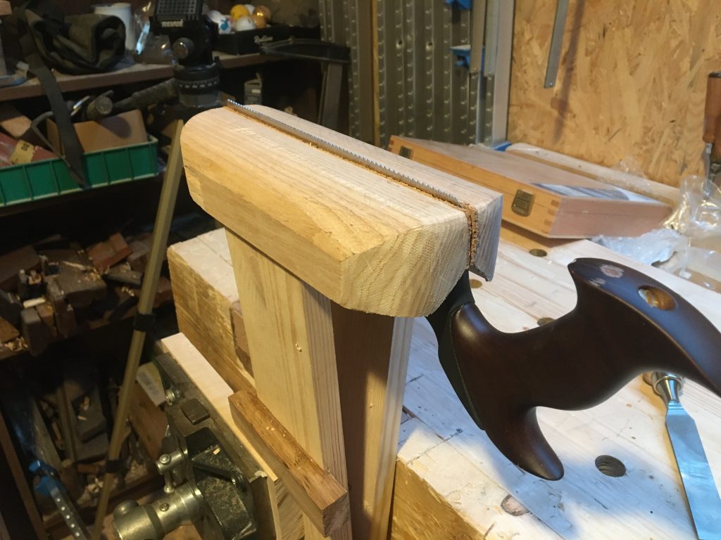 Bisher habe ich meine Sägen immer im Schraubstock geschärft, aber dieses gebeugte Arbeiten wurde mir zuletzt etwas lästig. Also habe ich aus ein paar herumliegenden Resten eine einfache Klappe gebaut – daher der bunte Mix aus Esche, Kiefer und Eiche. Die Spannbacken sind mit Kork belegt um ein Rutschen zu vermindern. Sie ist lang genug um kleinere Rückensägen ohne Umspannen zu schärfen. Hier ist die Veritas Dovetail-Säge auf dem Schärfstand.