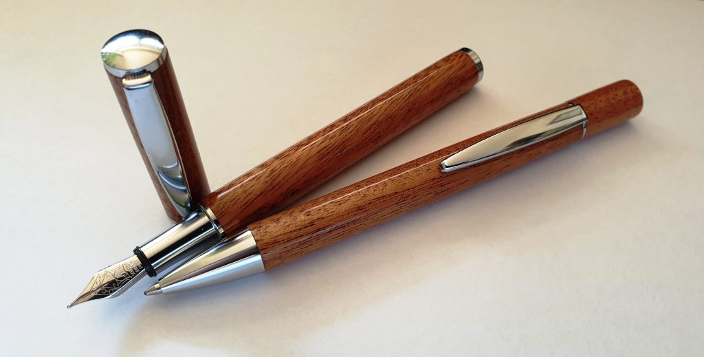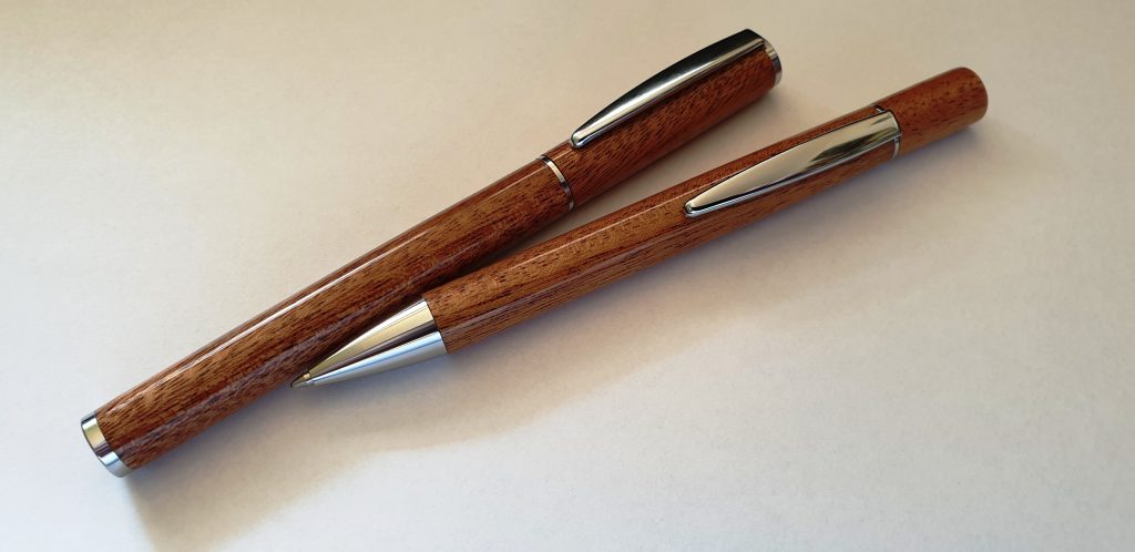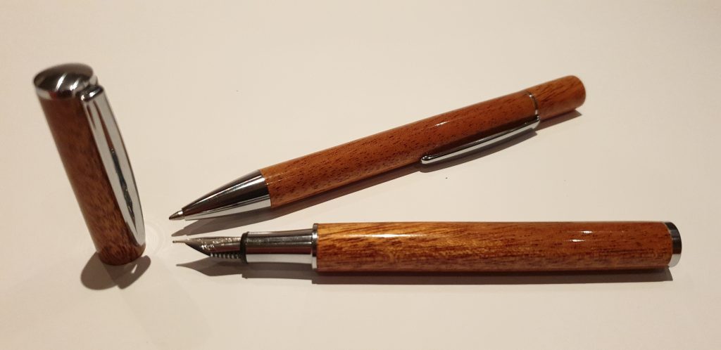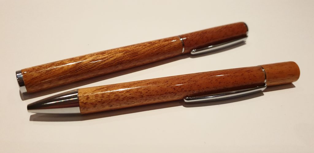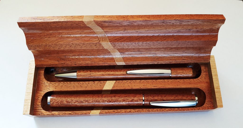 Schreibset aus Khaya-Mahagoni 9. März 2021Neue Beiträge, Schmuck/ObjekteMartin FleischmannDas Schreibset aus Khaya-Mahagoni besteht aus Füllfederhalter und Drehkugelschreiber. Das Etui ist aus Khaya-Mahagoni mit Ahorn-Inlays. Die Oberfläche ist mit Klarlack lackiert.teilen teilen merken