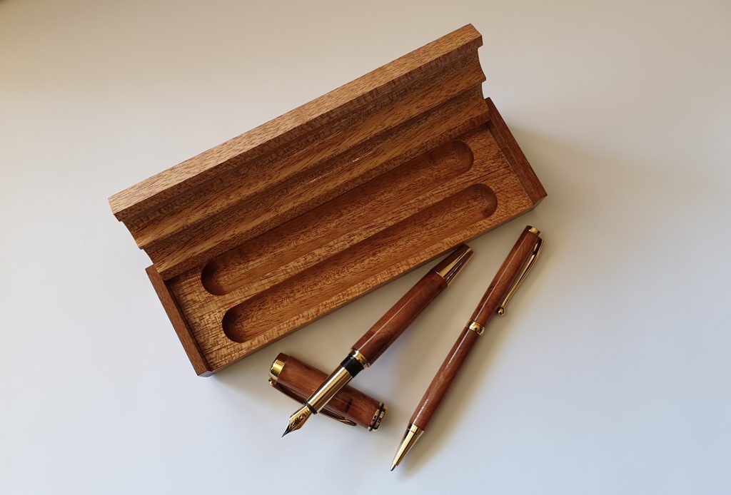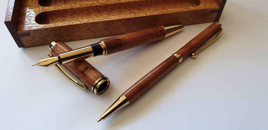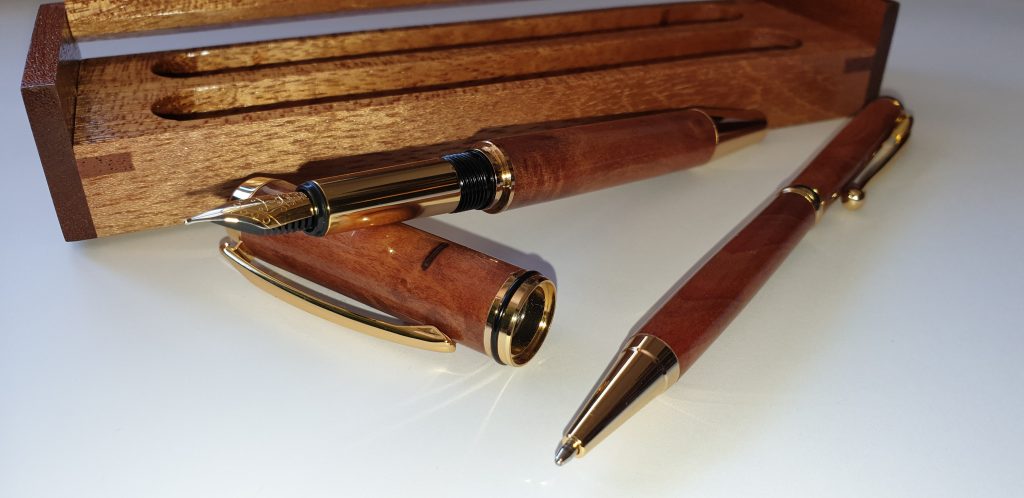 Edles Schreibset aus Vavona Maser. Holz: Vavona Maser stammt aus der Wurzelmaserknolle des Küsten-Mammutbaum (Sequoia sempervirens). Er wächst in den Küstengebieten Nordkaliforniens und im Süden Oregons in den USA. Oberfläche: Mehrfach mit Cyanacrylat behandelt, danach bis 12000 Körnung Nassschliff geschliffen, sowie zweifach mit CA-Polish poliert. Das Etui habe ich aus Meranti und Khaja Mahagoni hergestellt, die Oberfläche wurde mit Klarlack lackiert.