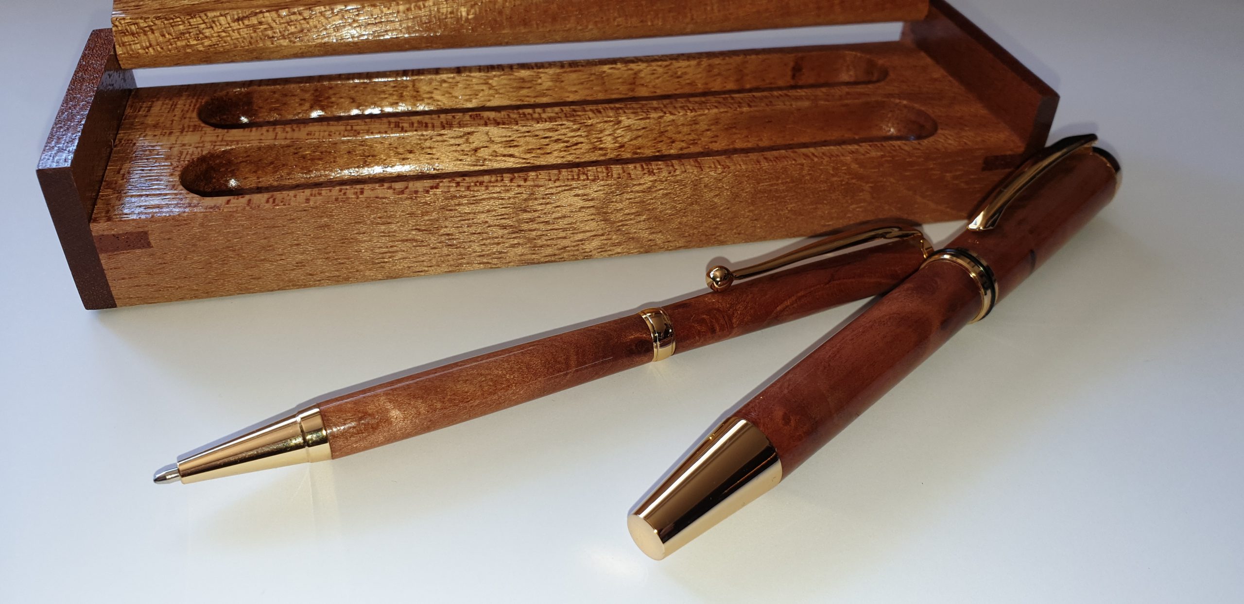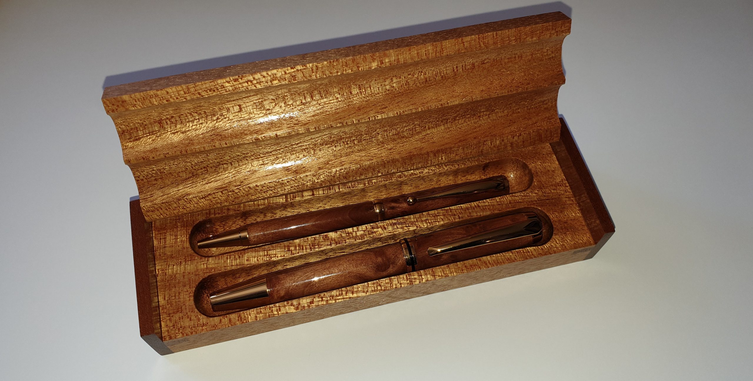 Edles Schreibset aus Vavona Maser. Holz: Vavona Maser stammt aus der Wurzelmaserknolle des Küsten-Mammutbaum (Sequoia sempervirens). Er wächst in den Küstengebieten Nordkaliforniens und im Süden Oregons in den USA. Oberfläche: Mehrfach mit Cyanacrylat behandelt, danach bis 12000 Körnung Nassschliff geschliffen, sowie zweifach mit CA-Polish poliert. Das Etui habe ich aus Meranti und Khaja Mahagoni hergestellt, die Oberfläche wurde mit Klarlack lackiert.