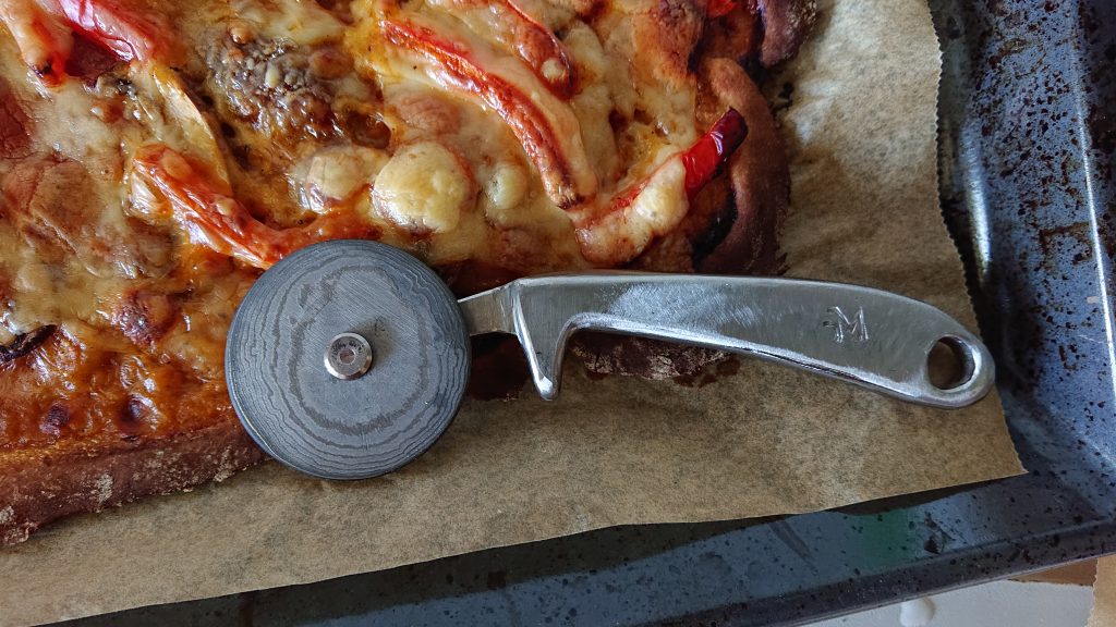Die Schneidscheibe habe ich aus rostfreien Suminagashi Stahl auf der Drehbank gedreht.