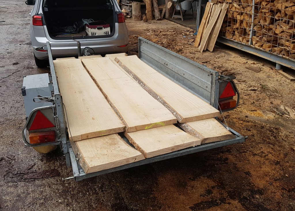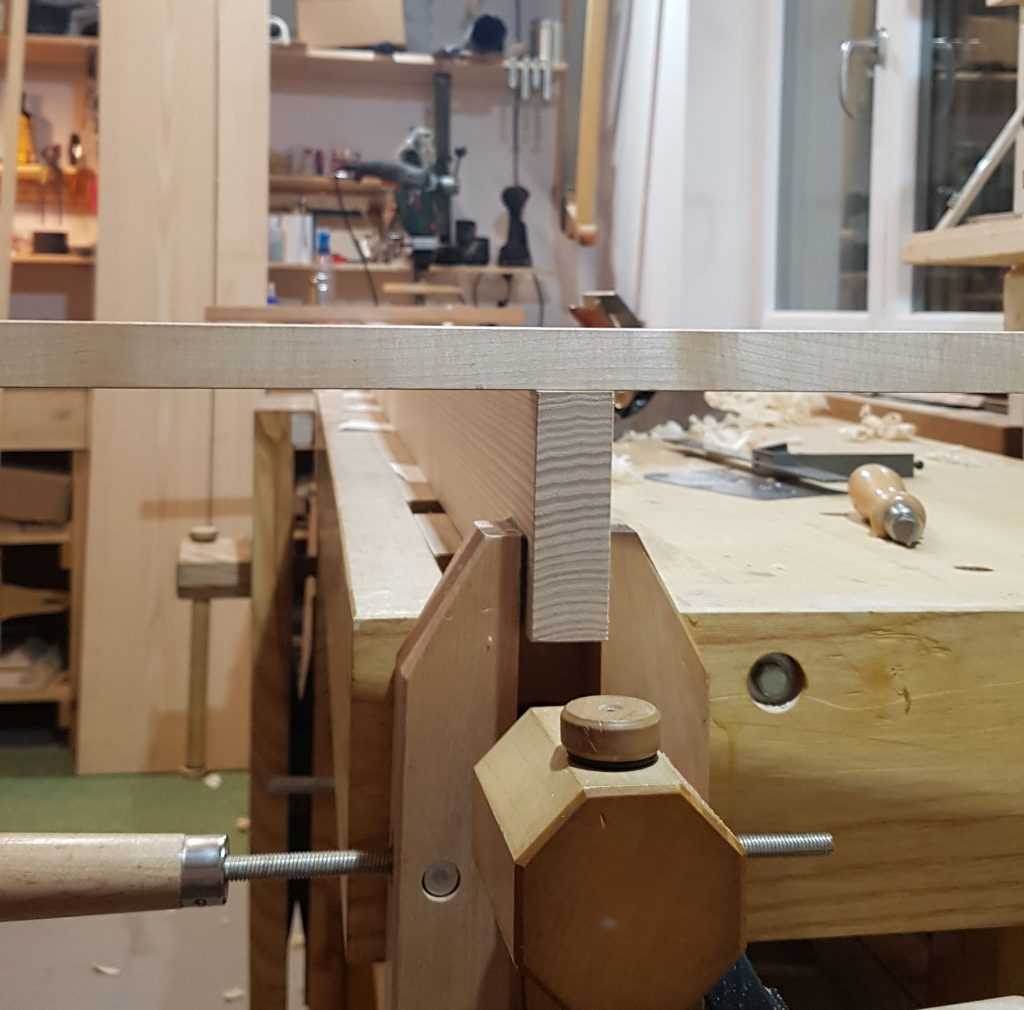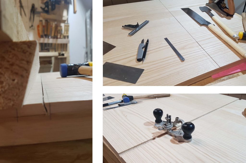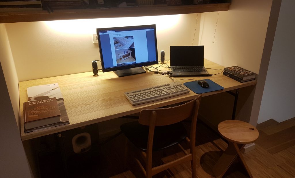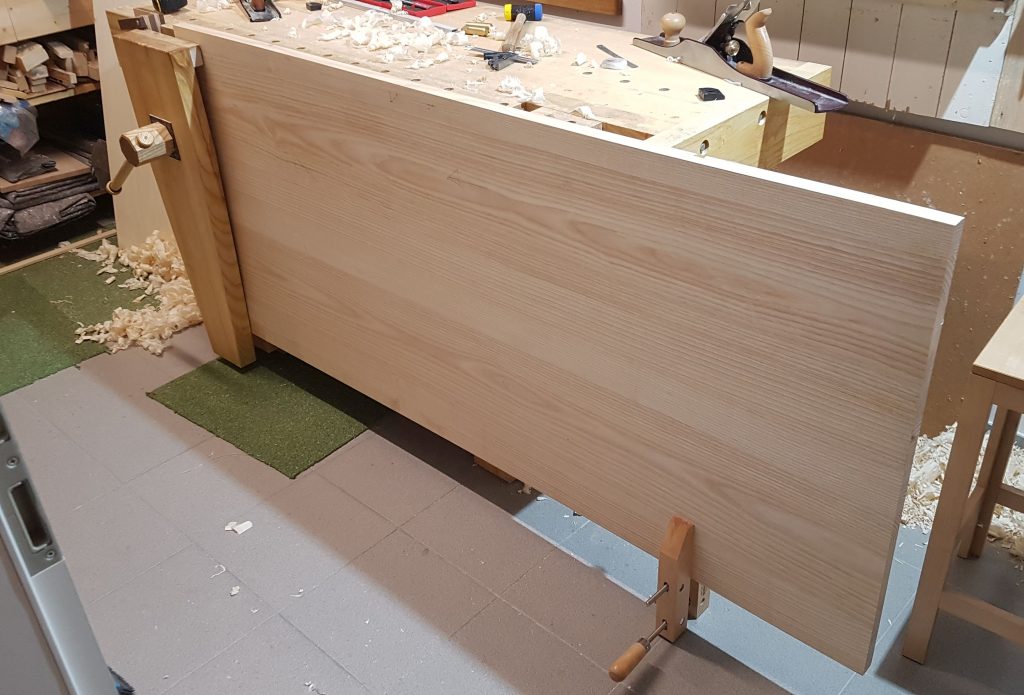 Die melamin-beschichtete Tischplatte für den Computerarbeitsplatz sollte durch eine aus Esche ersetzt werden. Das Holz aus dem Sägewerk wurde maschinell grob auf Maß gebracht, abgerichtet und auf Dicke gehobelt. Das Fügen erledigte ich von Hand; die einzelnen Bretter wurden dann verleimt, mit Ausnahme eines 5 cm breiten Streifens an der Vorderkante, der nach Herstellung der Gratnuten angeleimt wurde. An der Unterseite wurden traditionelle Gratleisten ausgeführt, die Nuten konnten auf voller Breite „durchgesägt“ werden. Vor Einbau der Gratleisten wurden alle Oberflächen von Hand fein geputzt und die Platte auf das endgültige Maß zugesägt. Zuletzt wurde die Oberfläche mit den Hobelspänen poliert und Paraffin-Öl aufgebracht. Als Werkzeuge kamen Handhobel in verschiedenen Größen zum Einsatz, Falzhobel und Grathobel, diverse japanische Sägen wie Azebiki und Ryoba, westliche Fuchsschwänze, Winkel, Streichmaße, Rohrzwingen und vieles andere mehr zum Einsatz. Verleimt wurde mit blauem Titebond.