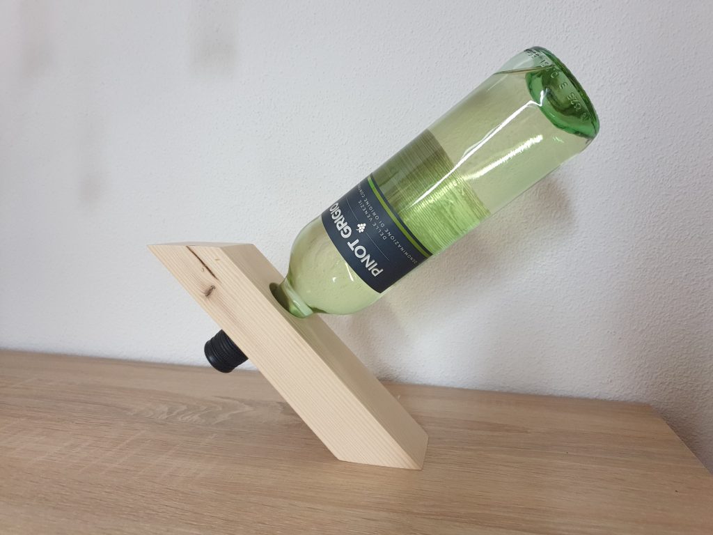 Der Weinflaschenhalter wurde aus einem Reststück Fichtenholz gefertigt. Neben einem Exzenterschleifer kam lediglich ein Forstnerbohrer und eine Paneelsäge zum Einsatz.